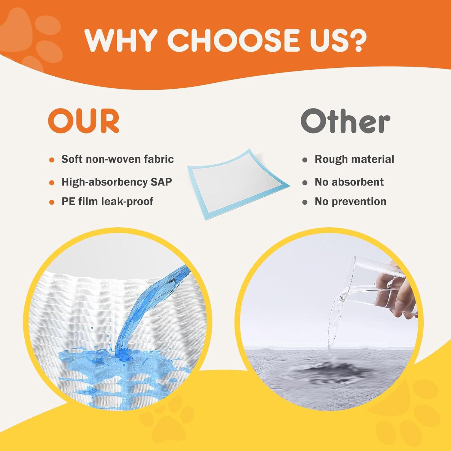 - High-Quality Multi-Layer Absorption Puppy Pads: Our product is meticulously crafted with multiple layers to ensure optimal absorption. The premium materials guarantee a clean home while providing comfort for your puppy.