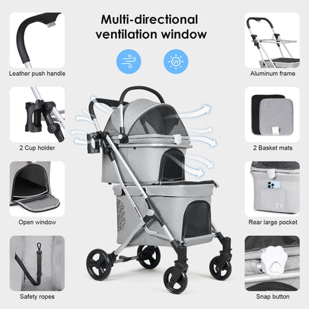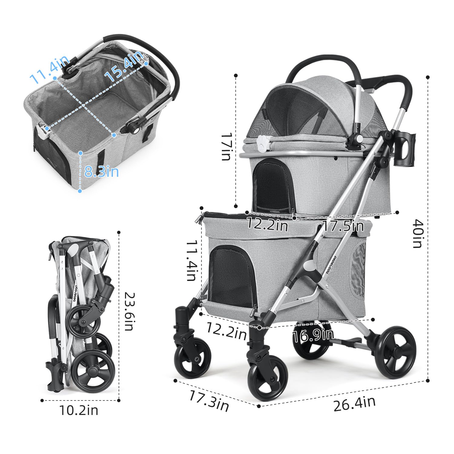 - Versatility: In addition to being a pet stroller, the upper level can be used as a separate pet carrier that can be placed in the car seat. This multi-functional design can meet the needs of different occasions and needs of pet carrying and rest, providing greater flexibility and practicality.