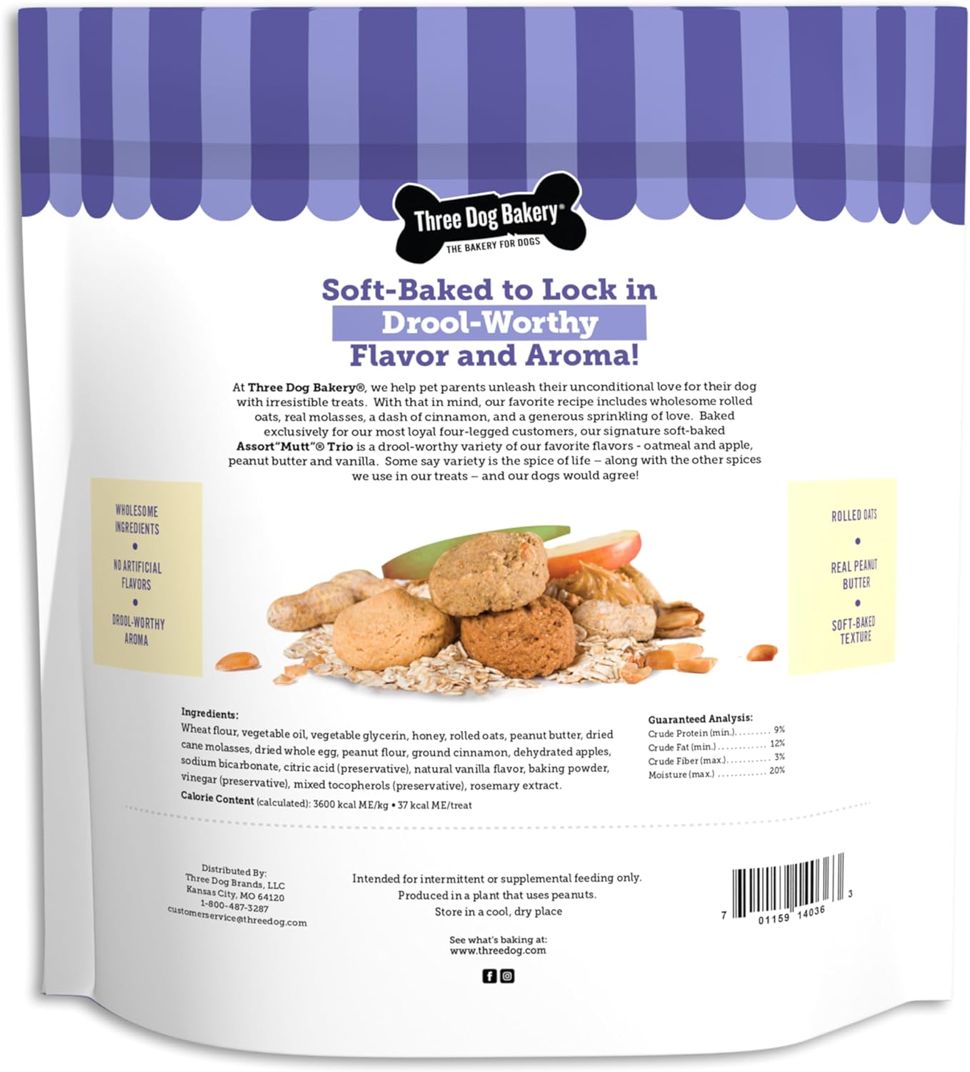 Spice up your dog's snack routine with the Three Dog Bakery Assort"Mutt" Trio. This 48oz bag offers a tasty mix of people-inspired flavors, including classic breakfast favorites like rolled oats, apple, peanut butter, and vanilla with a hint of cinnamon. Your fur baby will love the variety, and you'll appreciate knowing they're enjoying snacks made with real, wholesome ingredients. Keep your pup's tail wagging with this delicious assortment