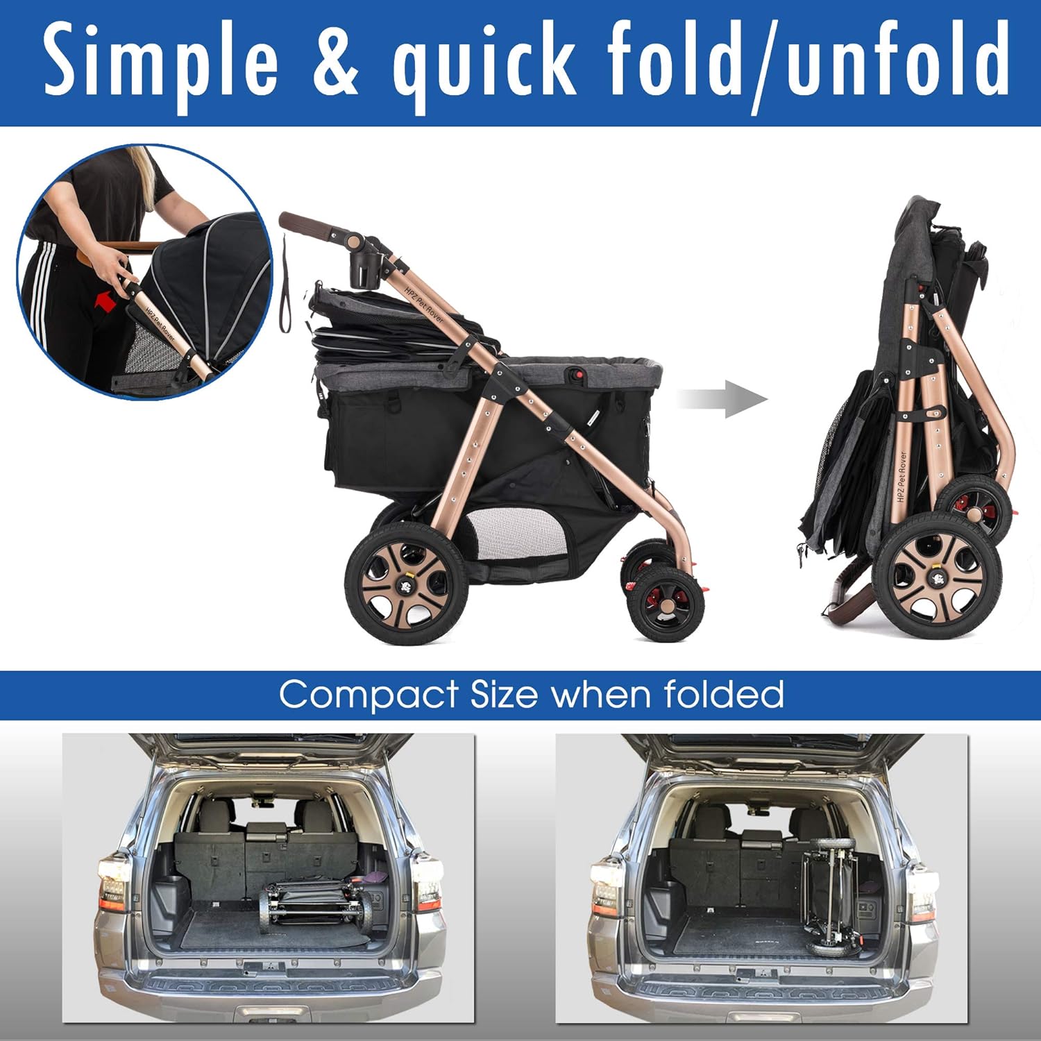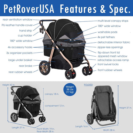 THE PREMIUM SUPER-SIZE PET STROLLER SUV from PetRoverUSA 👍 Pet Stroller Features: 🐶 100 LBS MAX CAPACITY - Heavy duty loading capacity allows one extra large to several smaller pets to share ride. 😺SUPER-SIZE PET COMPARTMENT - 32x20 inches pet compartment accommodates multiple pets comfortably. 🐶 INTEGRATED ACCESS RAMP – Revolutionary retractable access ramp allows pet with mobility and medical conditions to enter and exit the stroller with ease. 😺 2-WAY ZIPPER-LESS CANOPY - Innovative no-zip canopy features easy-locking latches, for immediate access to your pet from the front or rear. 🐶 RIGID ALUMINUM FRAME – The stroller frame is made of rust-free aluminum in an anodized gold color for light-weight, elegant, functional and reliable travel. 😺 PREMIUM FABRICS – PU-coated interior fabrics and weather-resistant outside fabric offer excellent durability. 🐶 4X TETHERS & ATTACHMENT HOOKS – 4 interior tethers secure several pets inside the stroller. 4 outside hooks attach accessories, and allow more pets to tag alongside. 😺 ALL-TERRAIN WHEELS - 4x durable heavy-duty rubber tires maximizes stability on all terrain. 🐶 LUXURY PU-LEATHER HANDLEBAR - Height adjustable handlebar with PU-leather cover provides ergonomic handling of the stroller. 😺 PLENTY OF STORAGE – 3 organizer pockets, cup holder and large under-basket provide plenty of storage space. 🐶 PET-FRIENDLY CONVENIENT FEATURES – Rear mesh window and 3-stop canopy opening settings provide viewing and access flexibility. Detachable interior fabric offers easy cleaning. 😺 NO ASSEMBLY REQUIRED – 1-minute Plug&Play assembly requires only the snap on of the front and rear wheels. Product Weight=30Lbs/Max Capacity=100 Lbs Stroller Size=37Lx42Hx19front&28rear-W" (16Lx28Wx37H" folded) Pet Compartment Floor=32Lx20W"