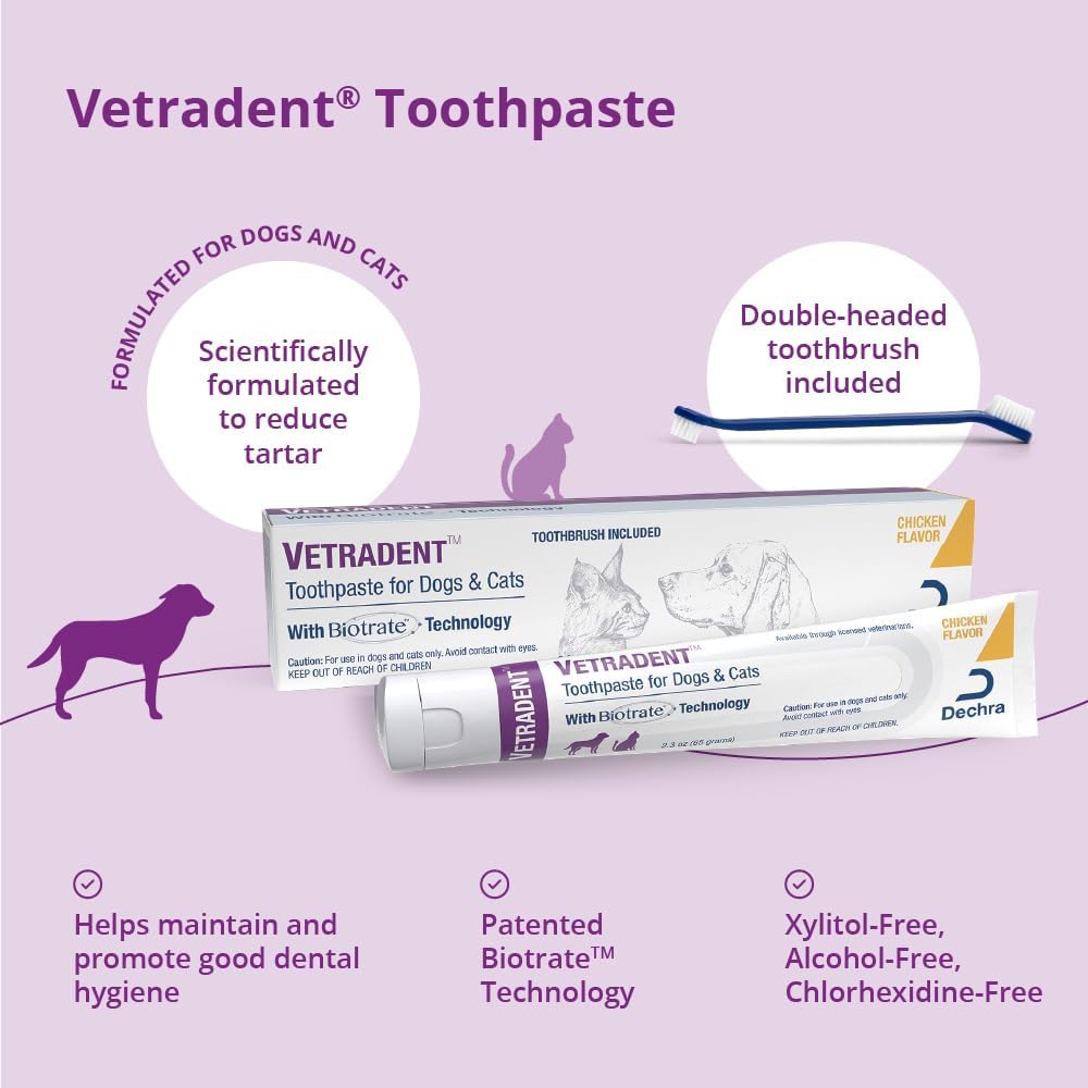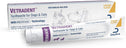 VETRADENT Toothpaste with Biotrate technology promotes good oral hygiene through brushing action, which helps fight tartar. Use a pea-sized amount of toothpaste and gently brush your pet’s teeth with a back and forth motion. No rinsing is required. Formulated for daily use in dogs and cats.