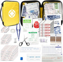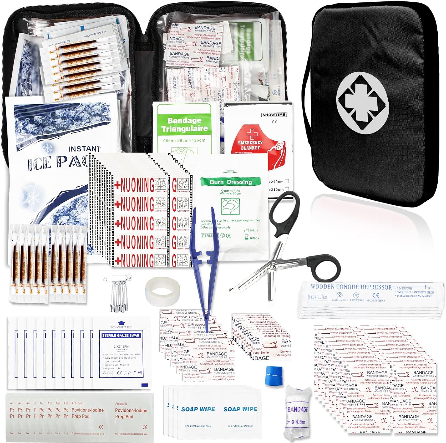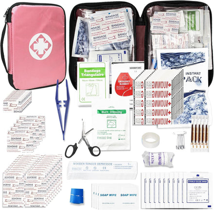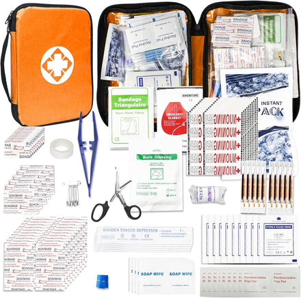- First Aid Kit Home Must Have Essentials -- Convenient waterproof first aid kit with plastic compartments for quick and easy access to what you need (Note: The zipper edge is not waterproof). Travel first aid essentials set contains 300 pieces of basic daily first aid necessities such as cotton swabs, 4 kinds of adhesive bandage, burn dressings, tongue depressors, PBT bandages, gauze sheets, safety pins, triangular bandages, instant ice packs, plastic scissors, plastic tweezers, etc.