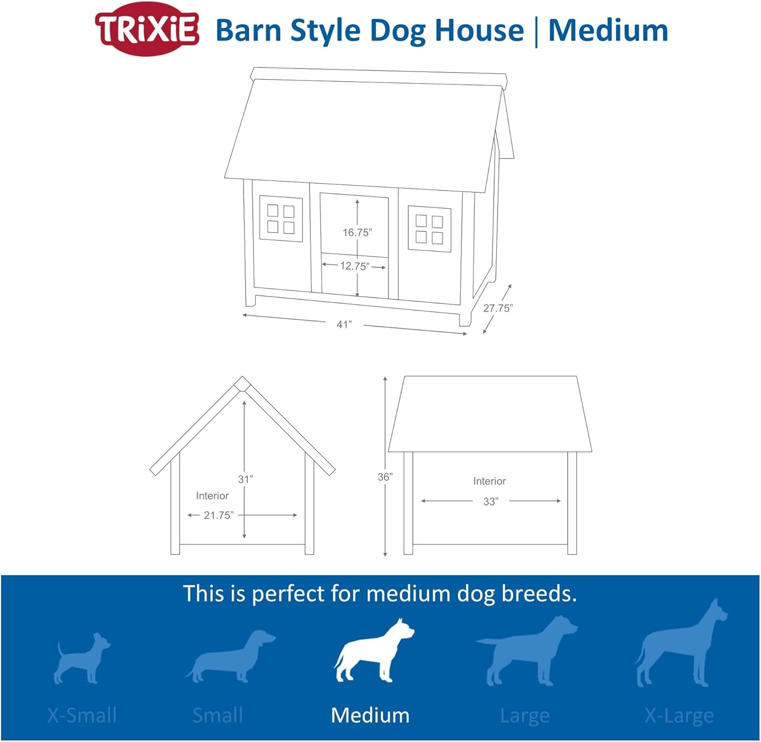 - DOG SHELTER: The TRIXIE Natura Barn Style is a medium dog house for outside & a great place for your pooch to rest. With dimensions of 41 x 27.75 x 36 in, it’s suitable for small- to medium-sized dogs