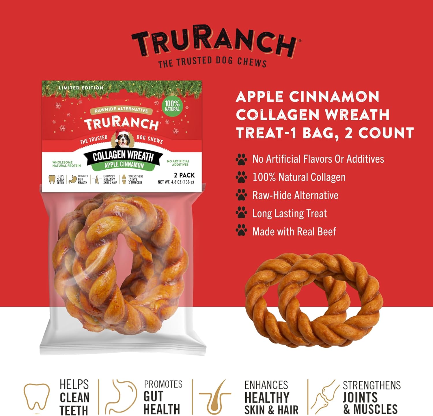 TRURANCH Apple Cinnamon Collagen Wreath Treat, 1 Bag, 2 Count, Limited Edition Holiday Stocking Stuffer, All-Natural Hydrolyzed Collagen, Rawhide Free, 50% Protein, Healthy Limited Ingredient Chew