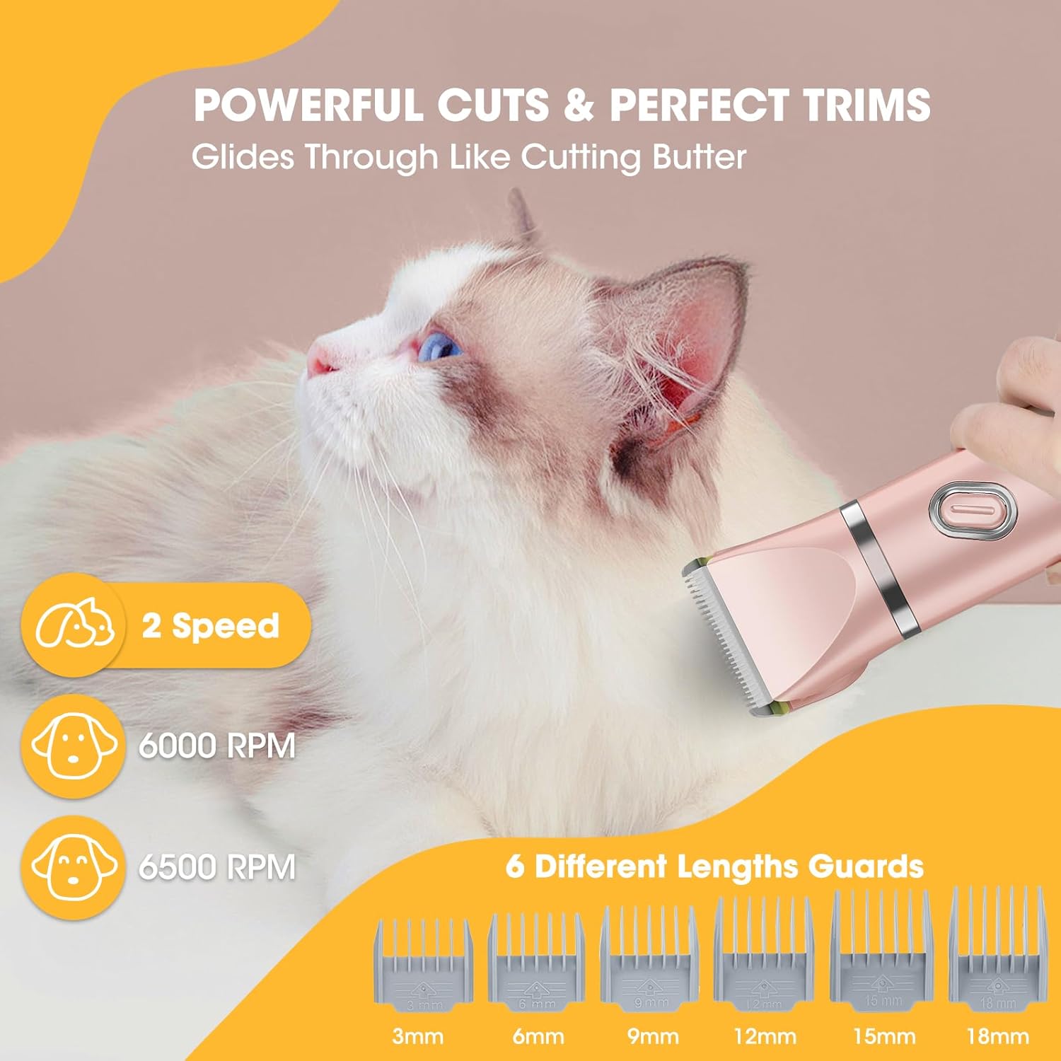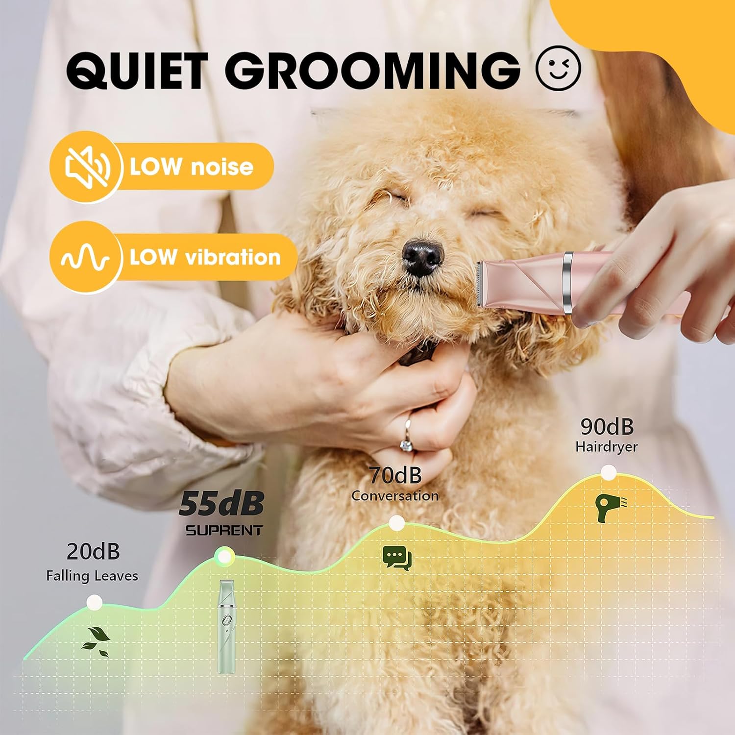 - SAFE & EFFECTIVE - This dog grooming clipper has rounded R-shaped blades to protect your pet's skin from scratches. It has plenty of power with two different speeds(6000 &6500 RPM). Our dog grooming supplies feature a superior motor and whisper-quiet technology, low noise≤ 50dB wont scare your dog. It makes your dogs feel easy and no afraid of cutting hair any more