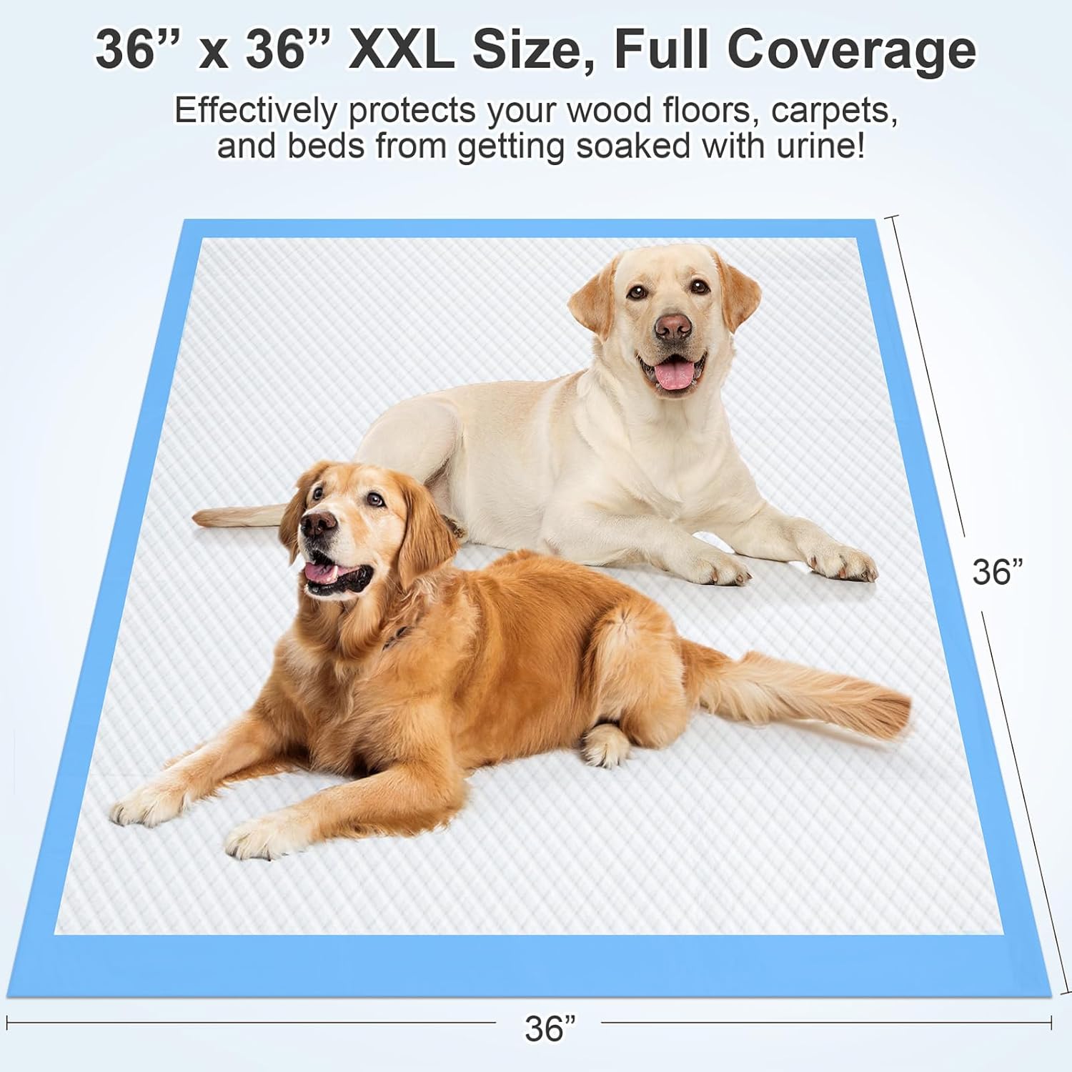 - 【36’’x36’’ 4XL Large Pee Pads for All Dogs & Adults】36’’x36’’ Extra Large Pee Pads are larger, and thicker than standard disposal pads. This size is perfect for puppies, adult dogs, senior dogs, incontinent dogs, kittens, cats, or other pets,extra large area for all-around protection of your floors. It’s also great as a disposable bed pads for kid & adults!