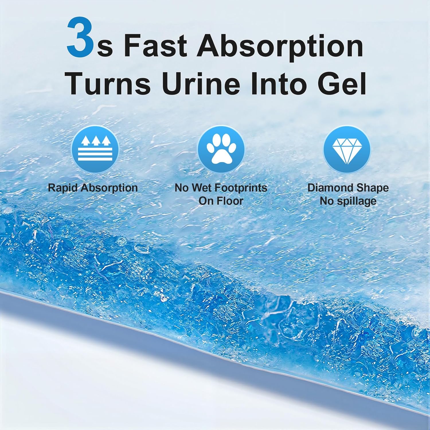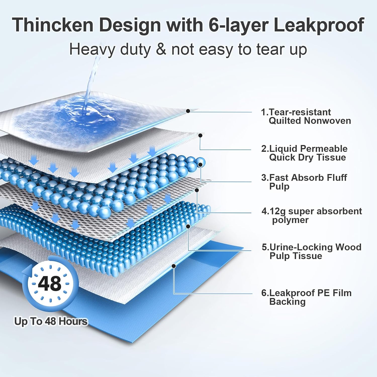 - 【Upgraded 6 Layers Heavy-duty Construction】Dog Pee Pads are designed with 6 premium polymer layers that help absorb liquids, urine, or accidents more quickly, locking it away to help control odor and wetness. And heavy-duty dog training pads is more durable & thicker than others,no rips,not tear easily when dog walks across.