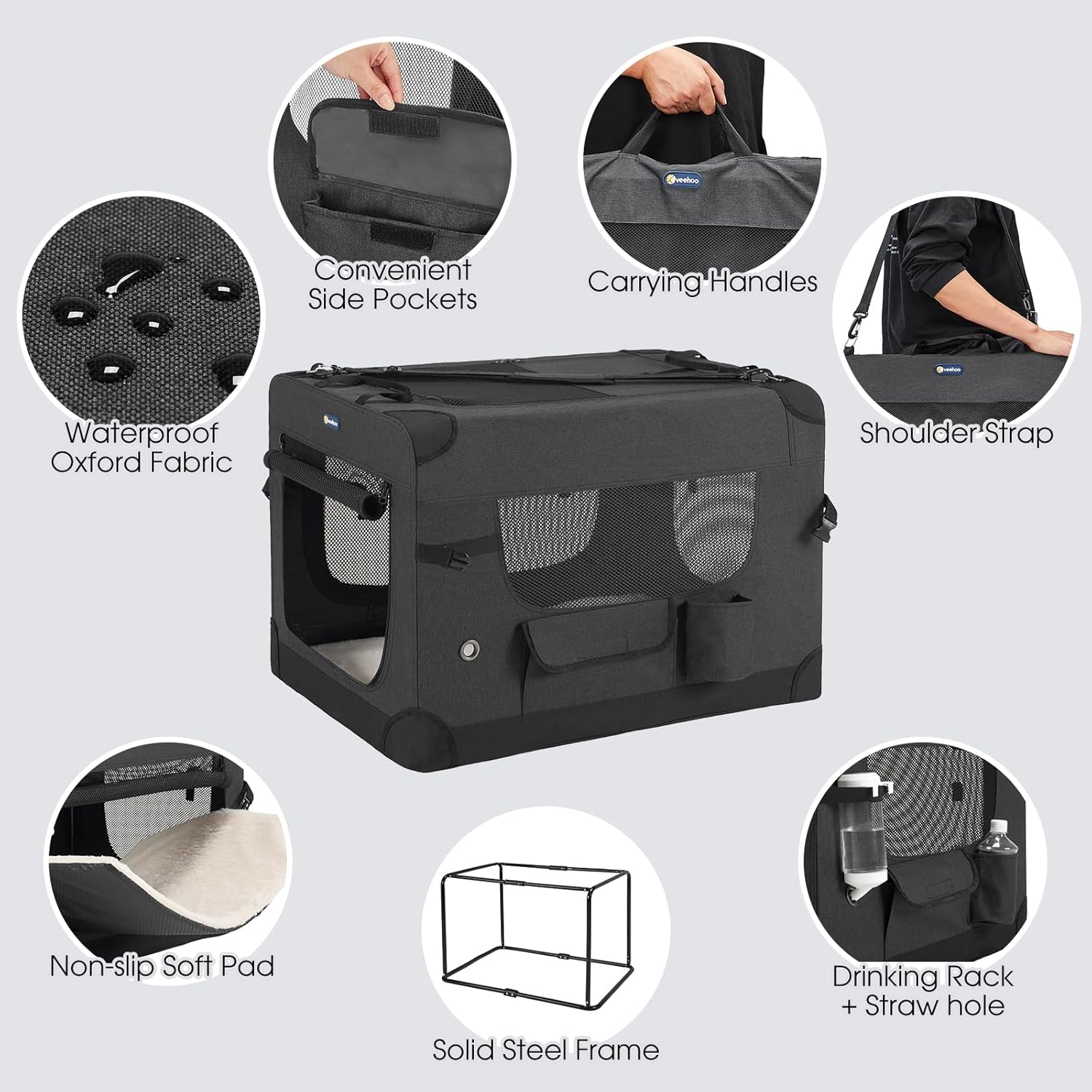 - Detailed Design - There are many other thoughtful details in our dog Kennel. 600D oxford cloth, scratch-resistant and durable. Waterproof bottom, convenient side pockets, non-slip and washable soft pad, drinking rack + straw hole and so on.