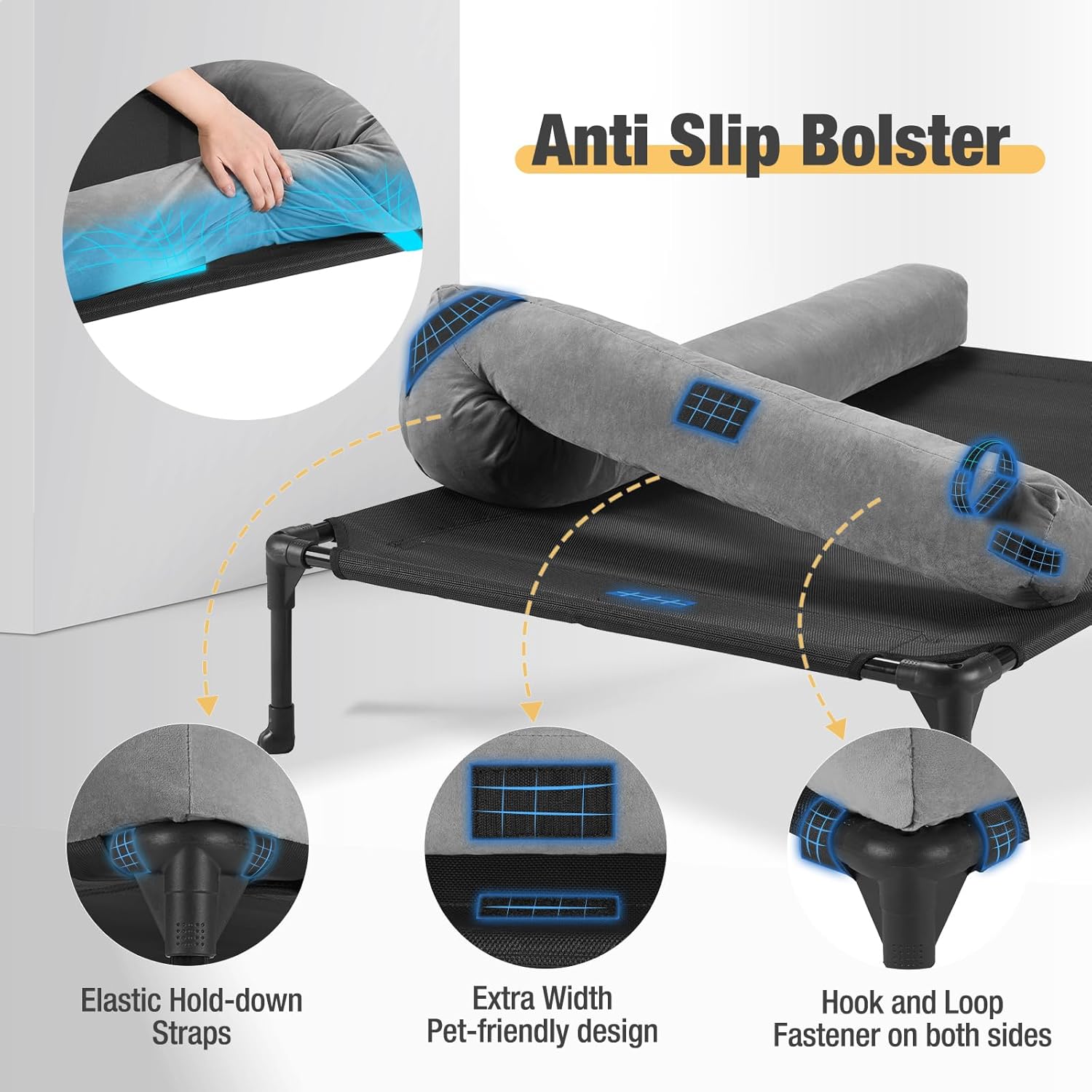 - L-shaped Bolster Design: The L-shaped pillow is securely attached around the outdoor dog bed with hook and loop fastener & straps. The elevated dog bed allows your dog to lie down comfortably, and the raised edges offer support for the head and body