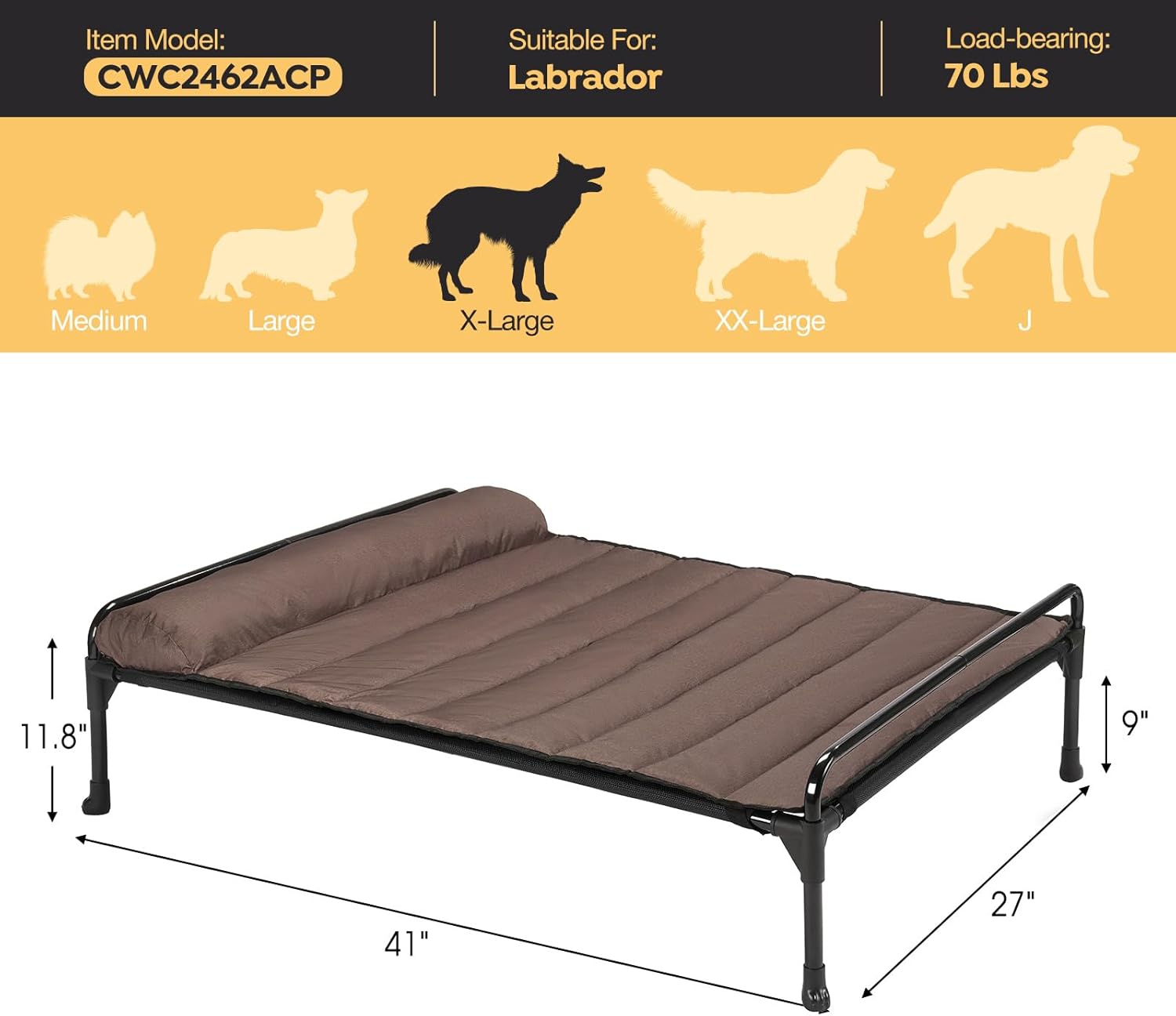 - Size: 41.0"L x 27.0"W x 11.8"Th (104*69*30cm). Elevate your pet's relaxation with our raised dog bed, designed for airflow to cool in the heat, and raised to protect from damp and chilly surfaces. Perfect for keeping your furry friends comfy and dry all year round