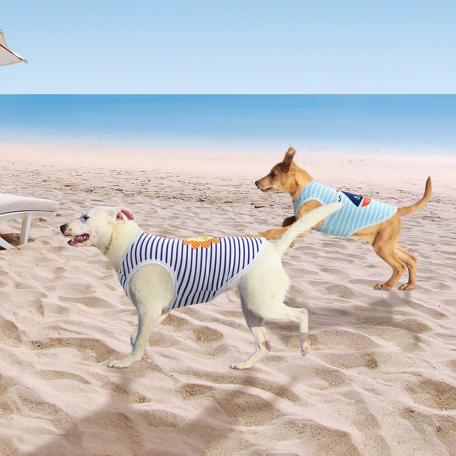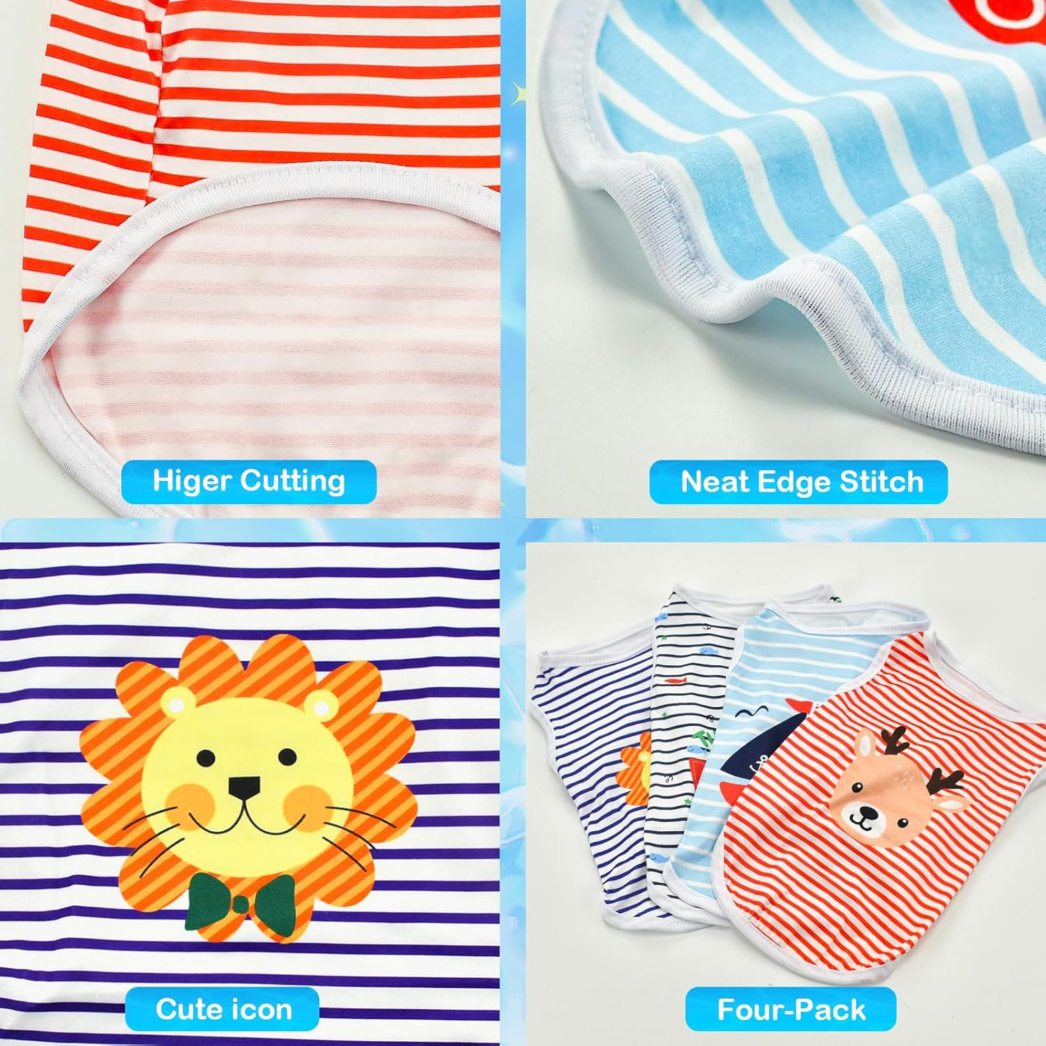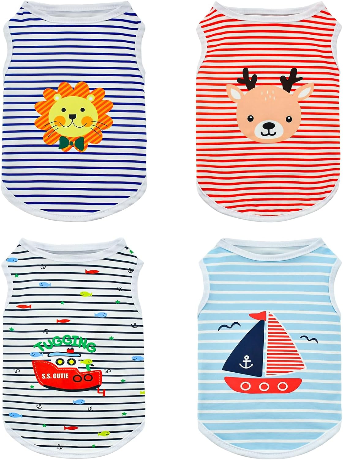 - 【4 Pcs in One Package】You will get 4pcs dog sleeveless shirts, cost-effective, a blue striped dog shirt with a sailboat pattern, a navy stripe dog shirt with fish and tugging vessel pattern, a indigo stripe dog tank top with cute lion pattern, and a pink stripe dog tee shirt with deer pattern. These loveable pet shirts are suitable for both of boy and girl dogs or cats.
