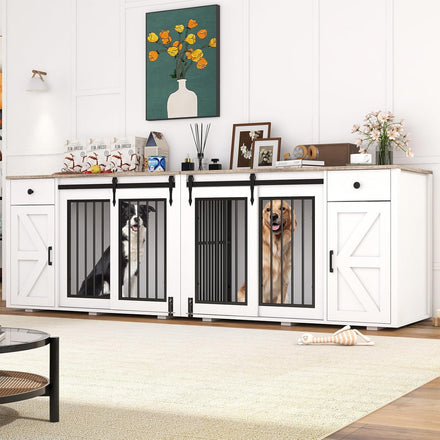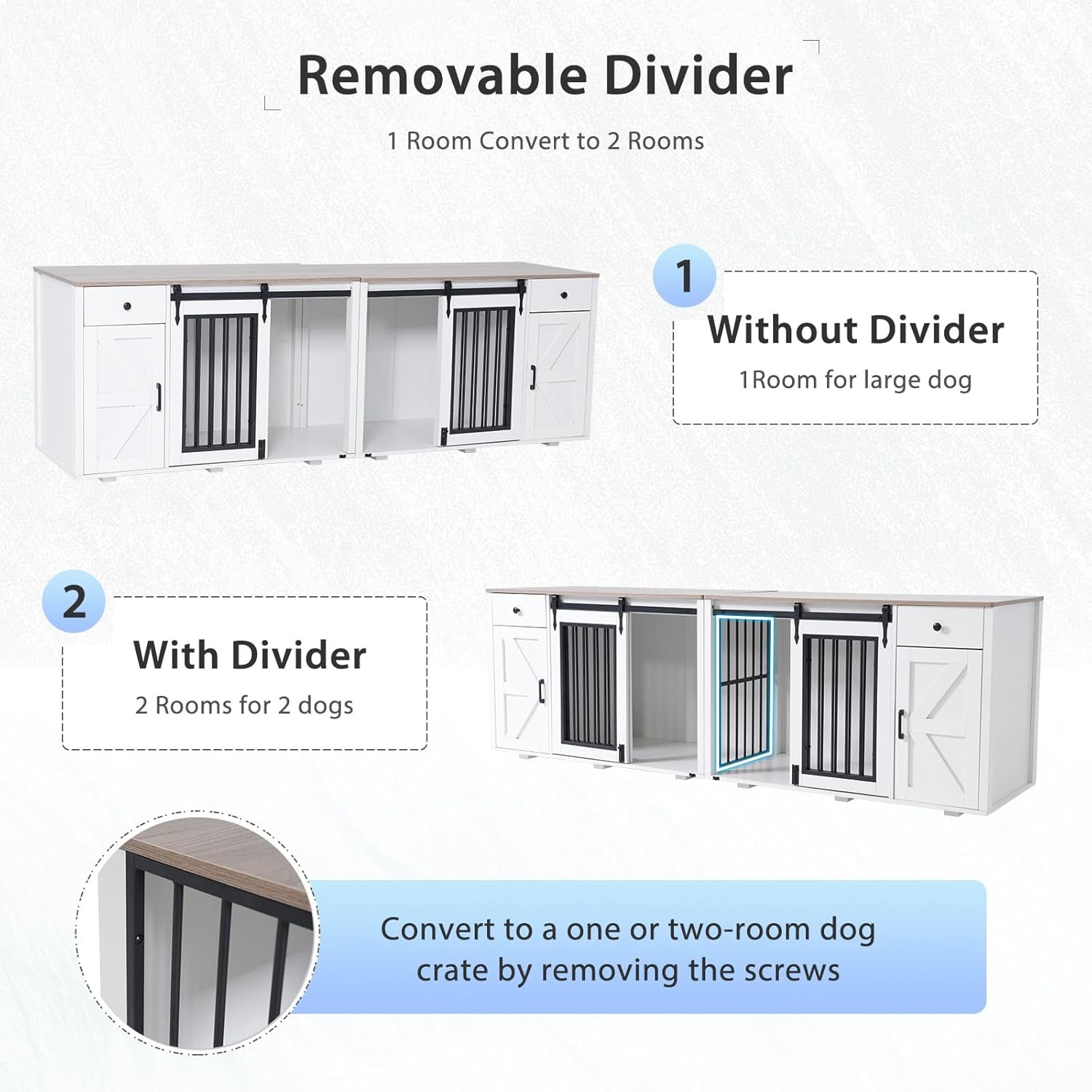 - Variable Space Design: Our extra large dog crate consists of two separate dog cage structures with innovative removable dividers. By removing or reinstalling the divider, you can easily switch between a spacious single room or two separate areas as needed. This flexible design offers customizable comfort as your pets grow.