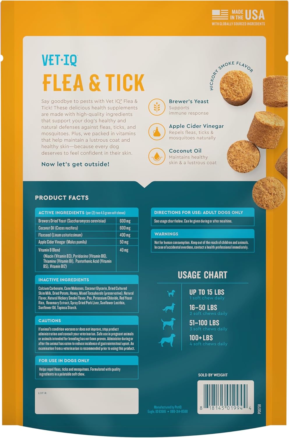- Health Supplement for Dogs: VetIQ Flea & Tick soft chews are a chemical-free way to help your dog naturally repel fleas, ticks, and mosquitoes, keeping them protected from pests without the use of harsh chemicals