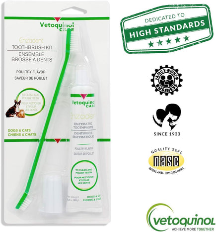Vetoquinol Enzadent Enzymatic Toothpaste Kit + Fingerbrush & Dual-End Toothbrush for Cats & Dogs – 3.2 oz, Poultry Flavor – Oral Dental Care Kit: Removes Plaque, Polishes Teeth & Freshens Breath