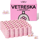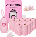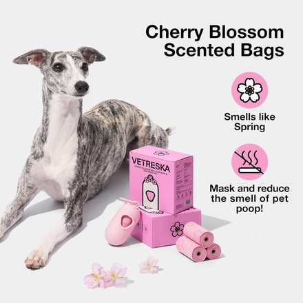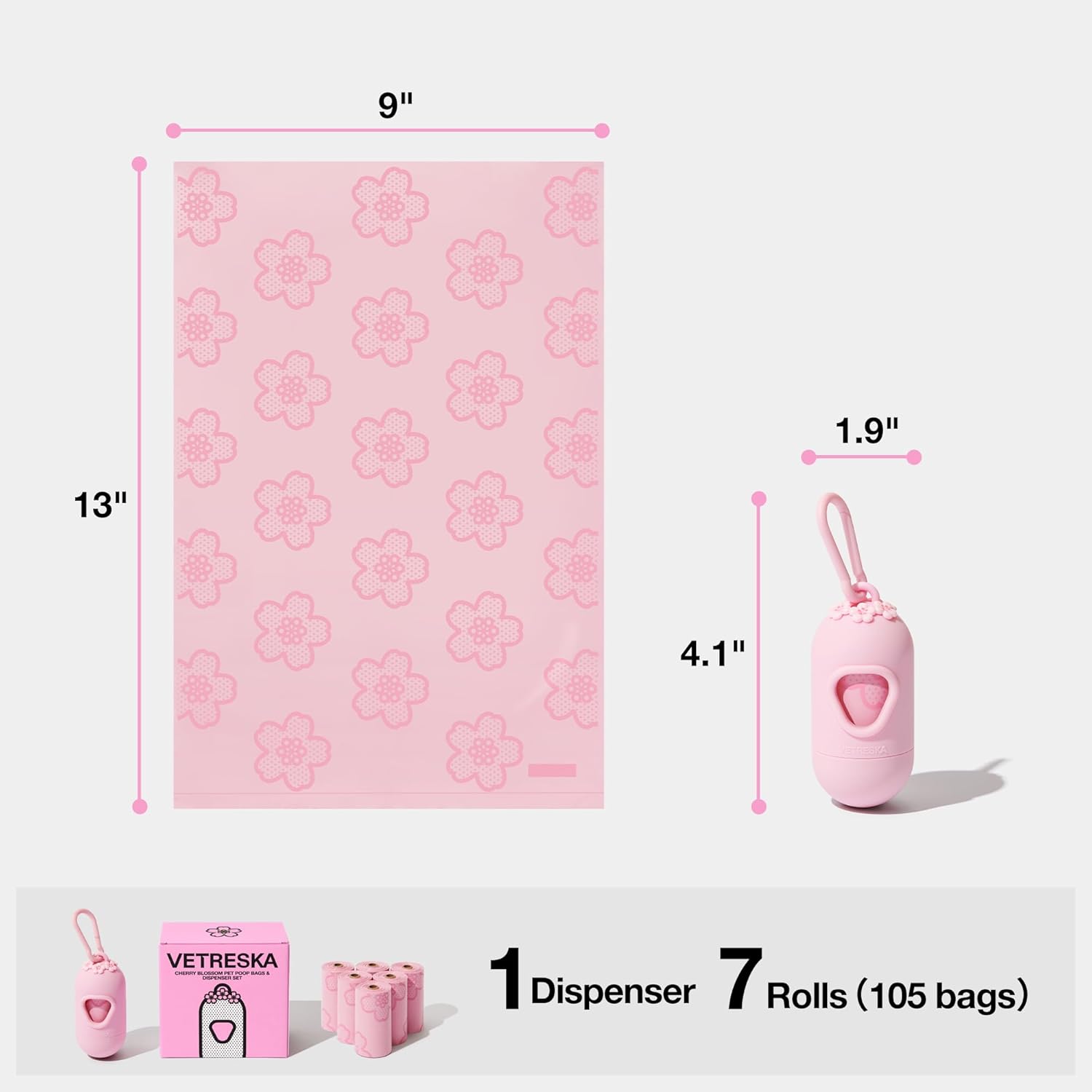 VETRESKA Dog Poop Bag Dispenser with Cherry Blossom Scented Poop Bags, Leak Proof and Extra Thick Pet Waste Bags, 1 Poop Bag Holder and 105 Bags for Dog Walking and Cats Litter, Pink