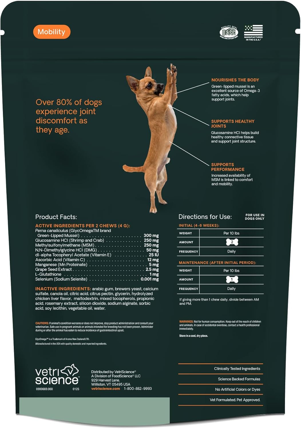 VetriScience Extra Strength Healthy Hip & Joint (new name, same great GlycoFlex Stage 3 formula) is the perfect daily glucosamine joint supplement for young, highly active dogs and adult dogs needing moderate or advanced joint support and protection. This vet-formulated joint chew for dogs is made with nutritious, science-backed ingredients like glucosamine and MSM, green-lipped mussel, and antioxidants to help cushion and lubricate joints and keep your dog flexible and comfortable during everyday activities that may put stress on the body. Pet parents typically report seeing positive effects within 4 weeks of starting their dog on the Extra Strength Healthy Hip & Joint formula. If your dog is starting to slow down or lose interest in their favorite household and outdoor activities, grab a bag of Extra Strength Healthy Hip & Joint today and see the results for yourself. Once dogs get a taste of the delicious flavor and chewy texture, they'll be begging for more. Our dog and cat supplements are certified by the National Animal Supplement Council (NASC), routinely undergo third-party testing, and contain no hidden ingredients, artificial flavors, synthetic colors or preservatives.