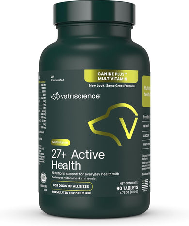 Give your dog the support they need with Senior 27+ Active Health (new name, same great Canine Plus Senior Multivitamin). These multivitamin chews are vet-formulated for daily health and vitality and packed with 27+ essential nutrients, including vitamins, minerals, antioxidants, and fatty acids, to help balance your senior dog’s diet and fill nutritional gaps not covered by standard commercial dog food. Ideal for senior dogs of all breeds and sizes, this multivitamin for senior dogs supports heart, brain, immune, and joint health, while promoting healthy digestion, skin, and energy levels. It's perfect for dogs on homemade or raw diets, ensuring they receive the full spectrum of nutrients needed for optimal aging. Ingredients like arginine aid immune function and detox, while Omega-3 and -6 fatty acids from fish oil support brain, eye, and joint health. Antioxidants like vitamins A, C, and E protect against free radicals, while B vitamins support cellular health, mood, and energy. Designed for senior and geriatric dogs, these veggie -flavored chews are gentle on sensitive stomachs and easy to administer. Give your dog a daily boost with this comprehensive senior dog multivitamin to keep them happy, healthy, and thriving in their golden years. Our dog and cat supplements are certified by the National Animal Supplement Council (NASC), routinely undergo third-party testing, and contain no hidden ingredients, artificial flavors, synthetic colors or preservatives.
