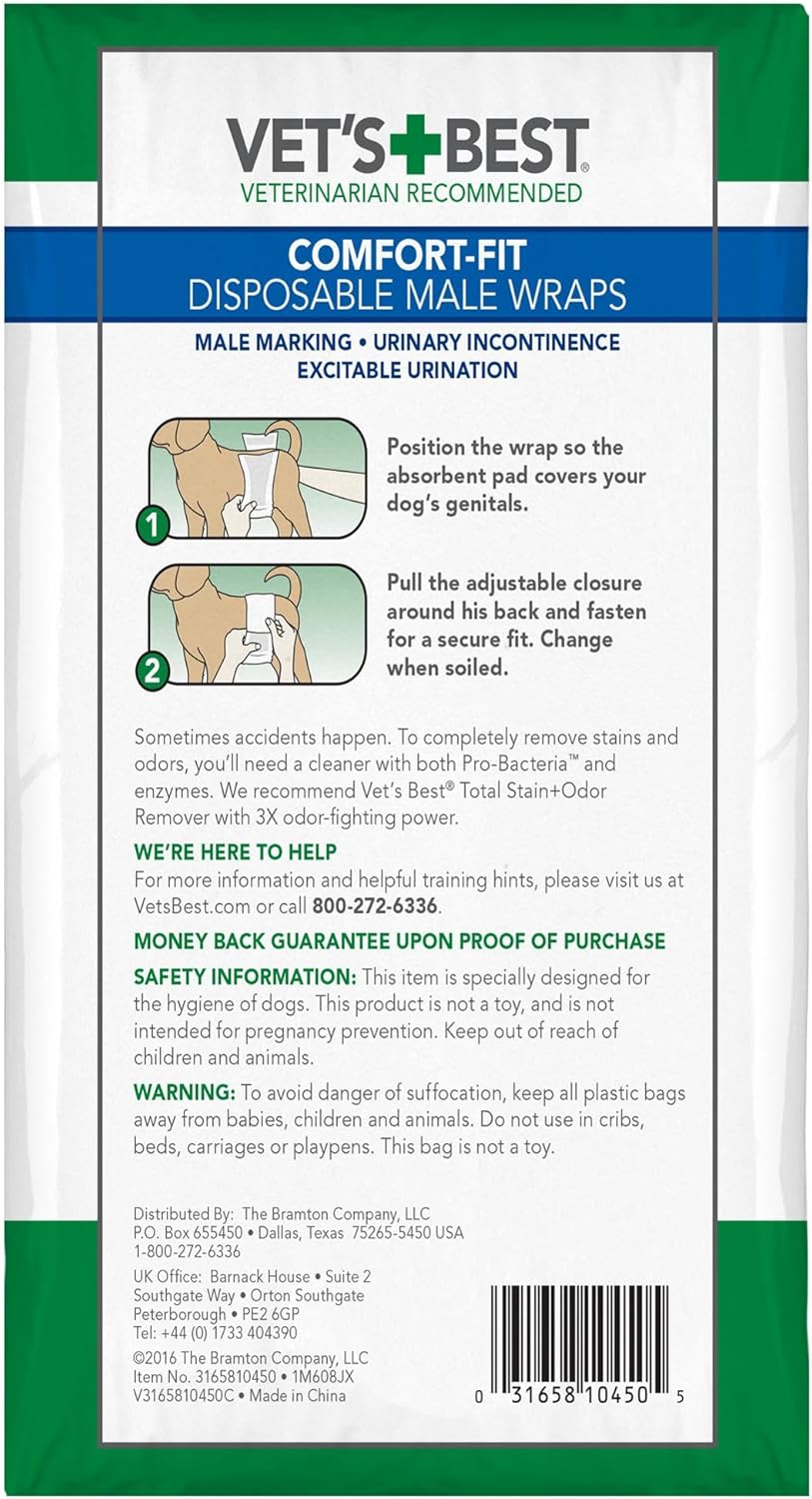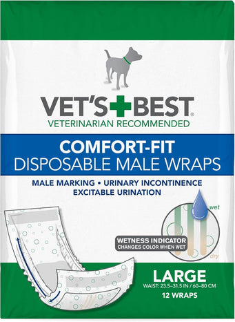 - COMFORTABLE - Vet’s Best Comfort-Fit Disposable Male Wraps in the Large size fits dogs with an 23.5 - 31.5 inch waist.