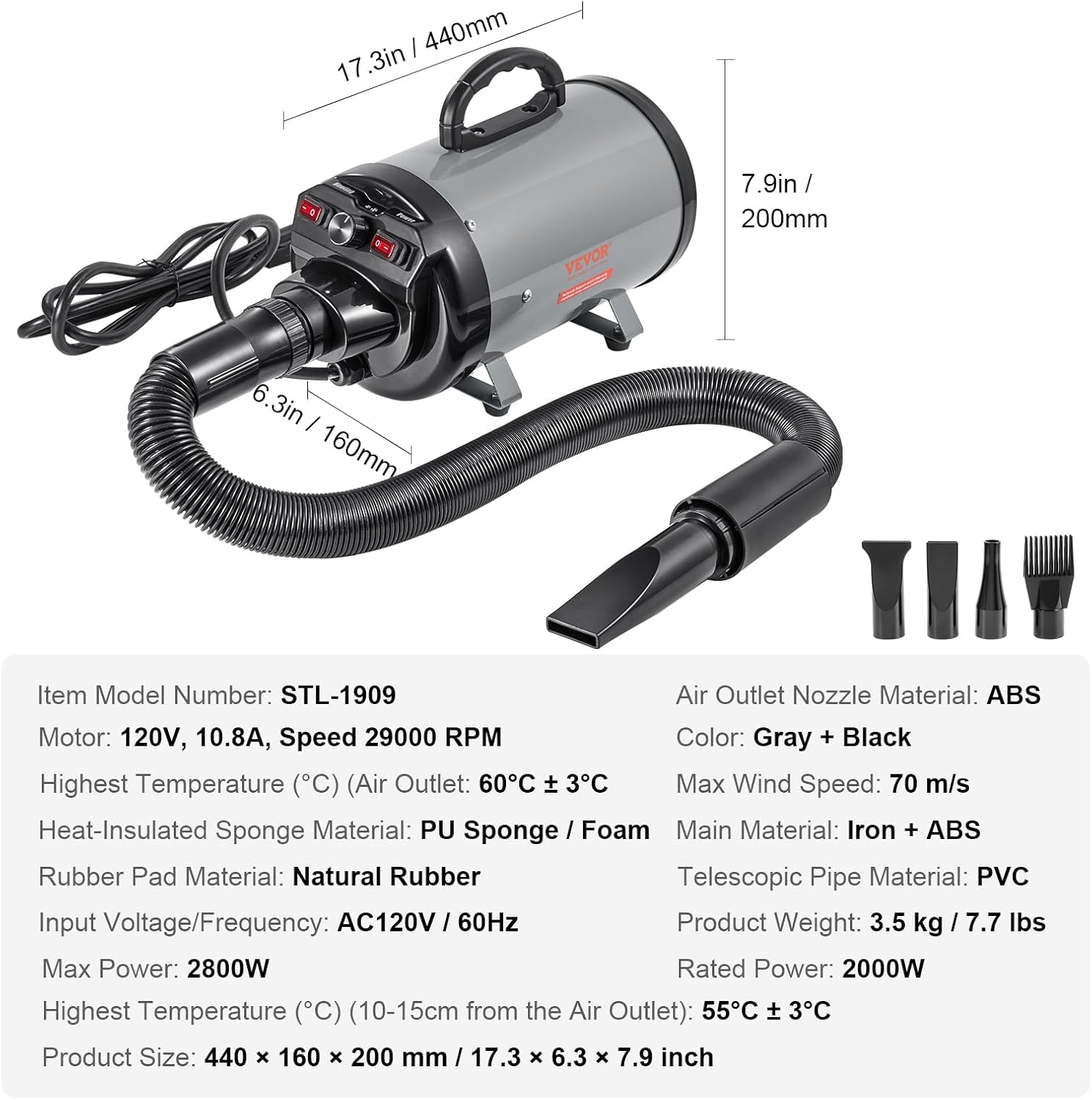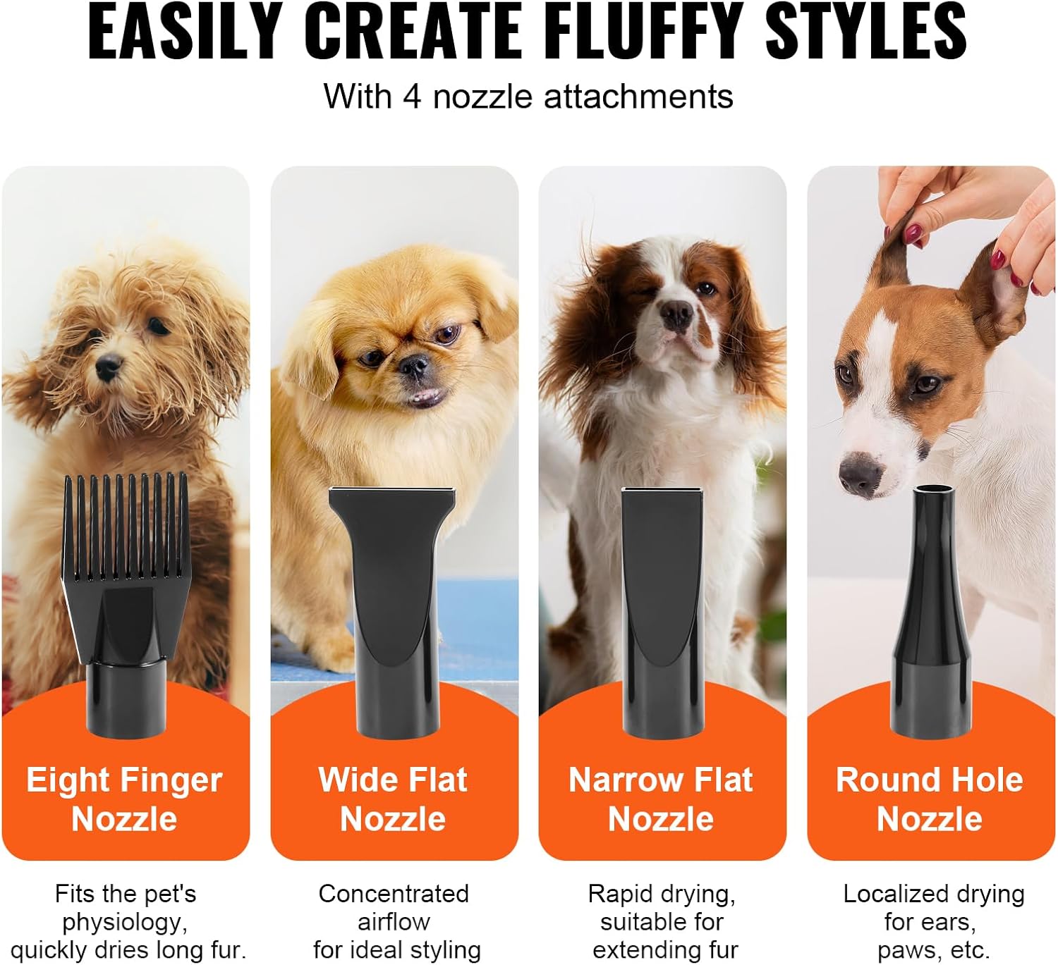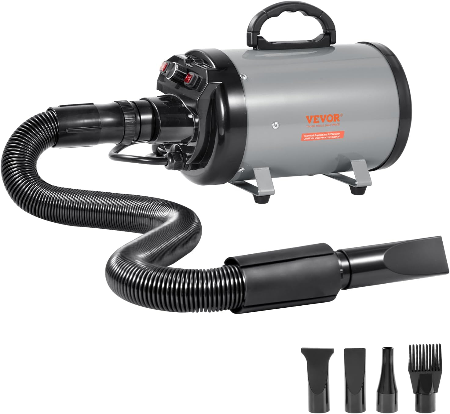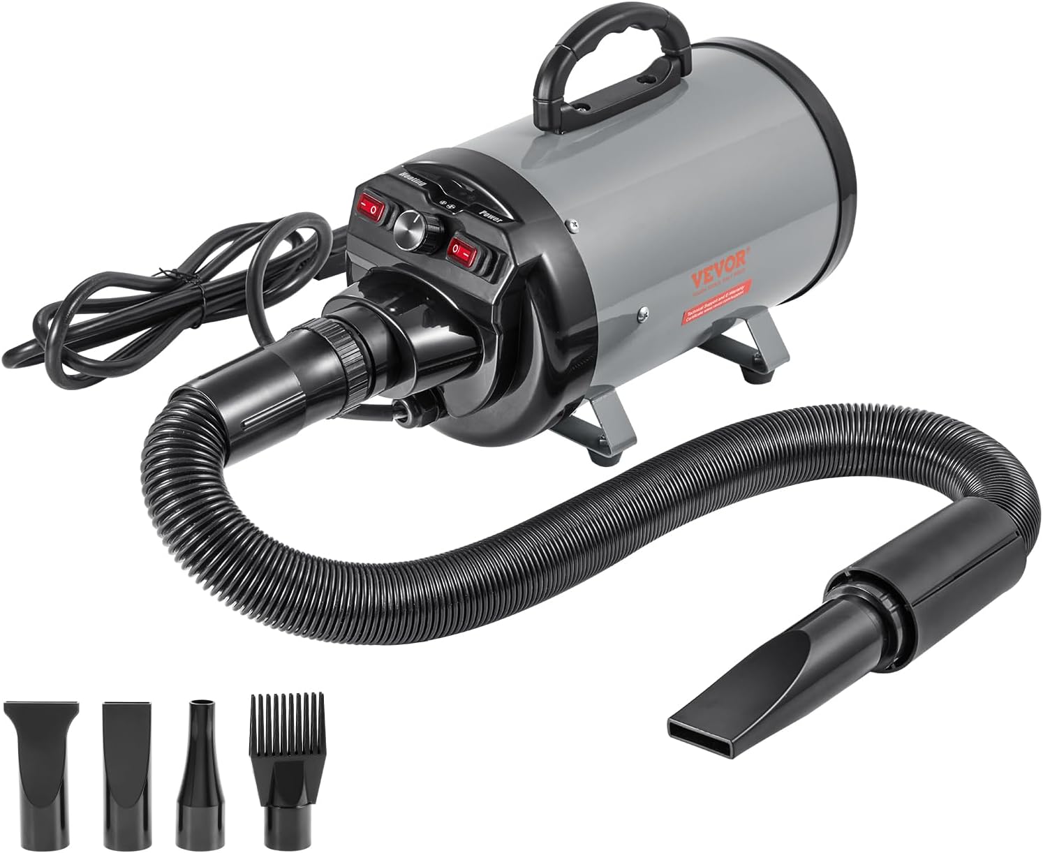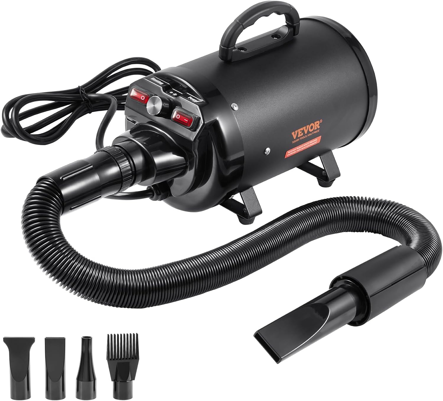 The adjustable extendable hose ensures thorough care of all your pet's parts, and the four different nozzles cater to various pet sizes and body areas. This makes drying more efficient. Use it more comfortable.