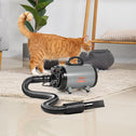 Our dog dryer with a powerful 2800W/4.3 HP motor reaches a max wind speed of 70m/s and offers temperature control ranging from 85°F to 130°F. It's suitable for various types of pets, ensuring quick drying of their fur.