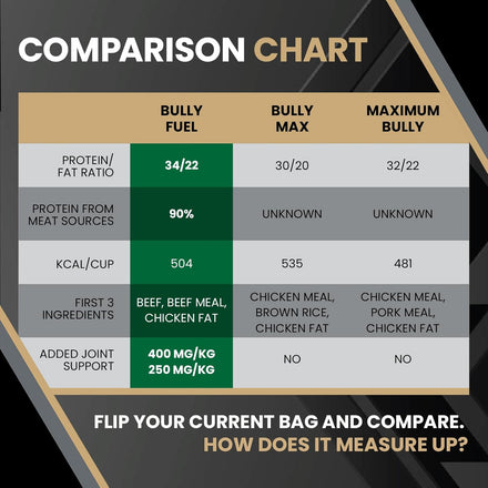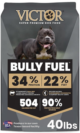 VICTOR Bully Fuel, beef and chicken recipe, boasts a 34/22 protein to fat ratio and includes over 500 calories per cup. This nutrient-dense recipe is specially formulated for bully breeds to maintain energy and performance. With real beef as the first ingredient to promote lean muscle growth, this recipe contains 90% protein from meat sources. Plus, the formula includes natural sources of glucosamine and chondroitin to provide joint support and high Omegas help nourish a healthy coat and skin. Bully Fuel is formulated without common allergens like corn, wheat, and soy – to keep your dog healthy and at peak performance. VICTOR Bully Fuel for Dogs is formulated to meet the nutritional levels established by the AAFCO Dog Food Nutrient Profiles for All Life Stages, except for growth of large size dogs (70 lb. or more as an adult).
