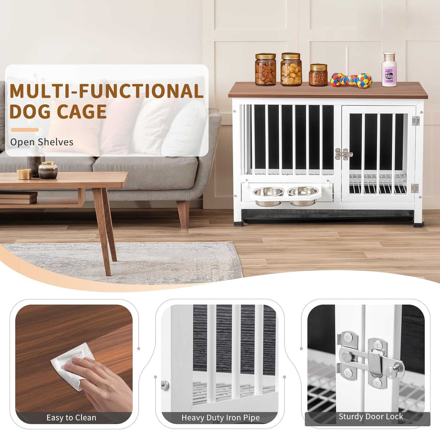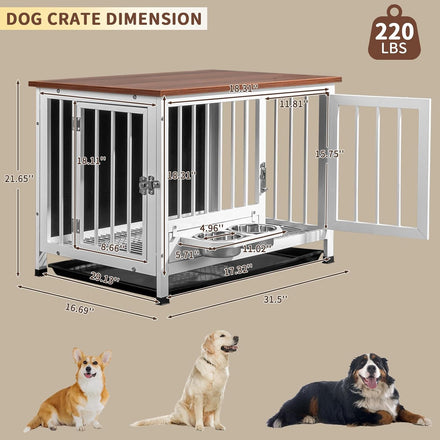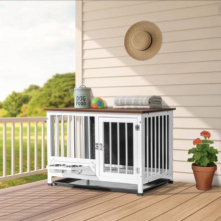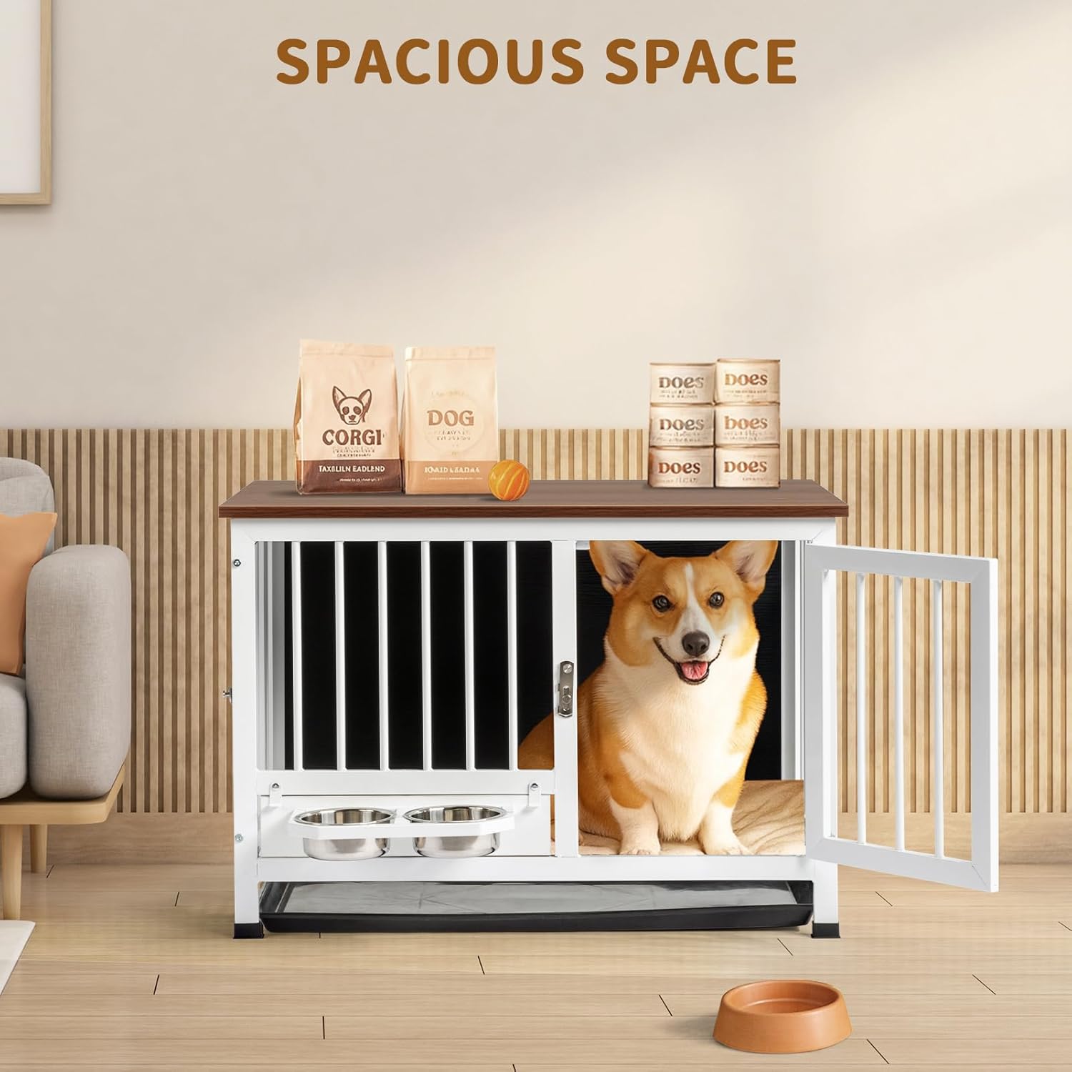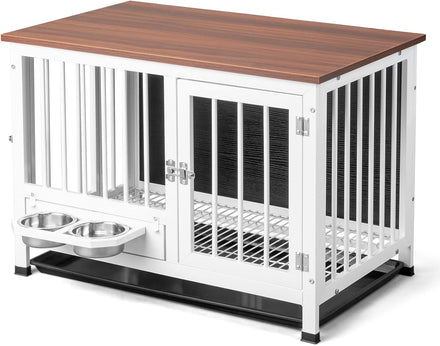 This 31-inch wooden dog crate serves as both a comfortable living space for your pet and an elegant piece of furniture for your home. It features a unique 360° rotating feeder system and a removable tray, offering unparalleled convenience for your daily pet care routine. Crafted from sturdy engineered wood and reinforced with durable metal, the dog crate for medium dogs seamlessly blends functionality with visual appeal—it can serve as a side table in the living room or as a decorative coffee table. This puppy crate not only ensures your dog's safety and comfort but also seamlessly integrates with your interior decor. Specifications: 1. Dimensions: (31.5 x 19.7 x 22) in / (80 x 50 x 56) cm 2. Front Frame Size: (30.3 x 18.9) in / (77 x 48) cm 3. Front Door Size: (11.8 x 15.7) in / (30 x 40) cm 4. Feeder Bracket Size: (11.4 x 5.9) in / (29 x 15) cm 5. Bowl Size: (5.1 x 5.1 x 2) in / (13 x 13 x 5) cm 6. Tray Size: (28.7 x 17.7 x 1.6) in / (73 x 45 x 4) cm 7. Side Door Size: (8.7 x 18.1) in / (22 x 46) cm 8. Material: Engineered Wood, Steel 9. Color: Rustic Brown & White Package Includes: 1 x Dog Crate Furniture
