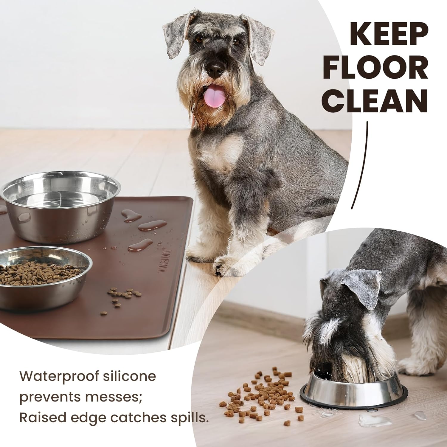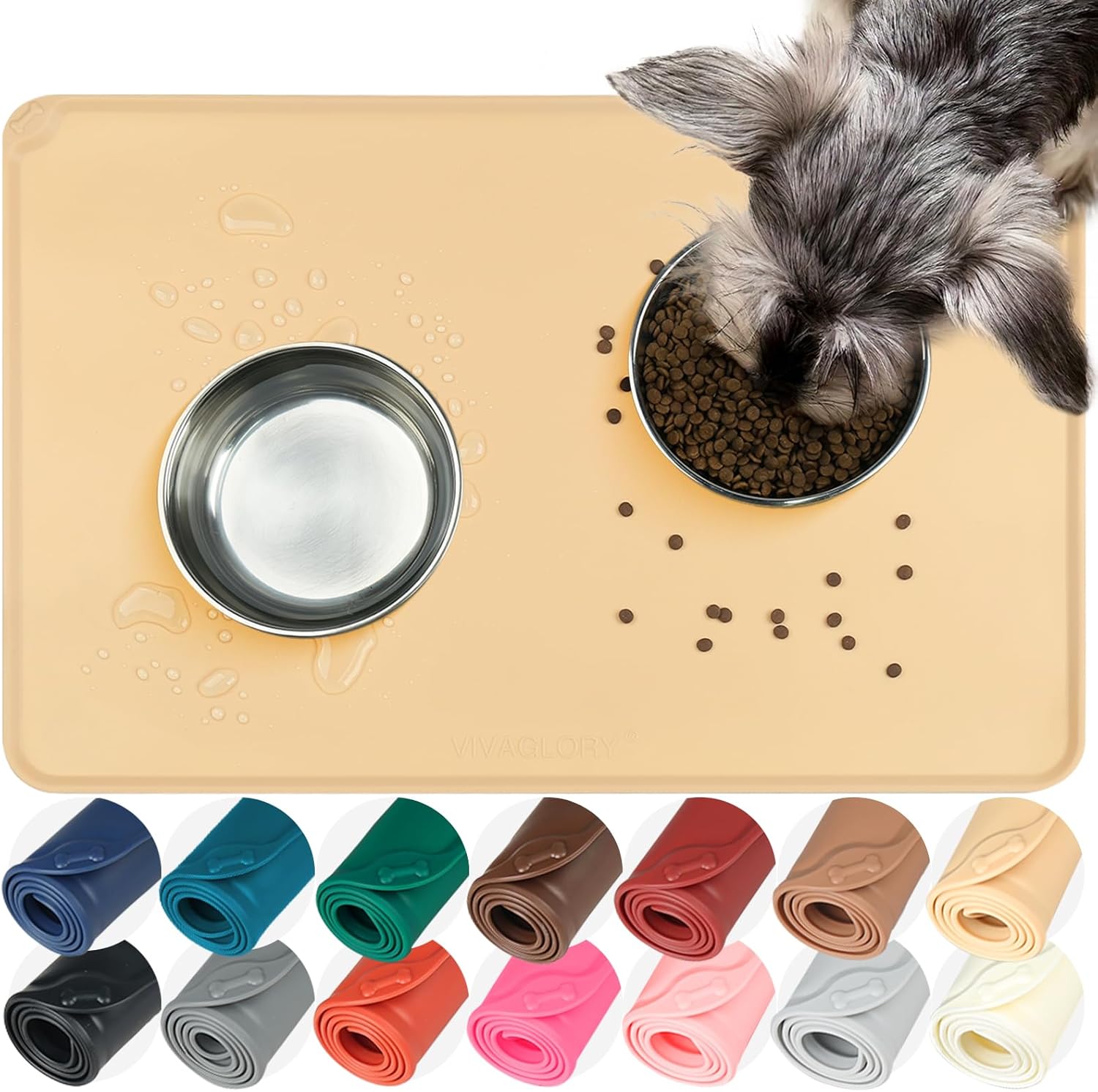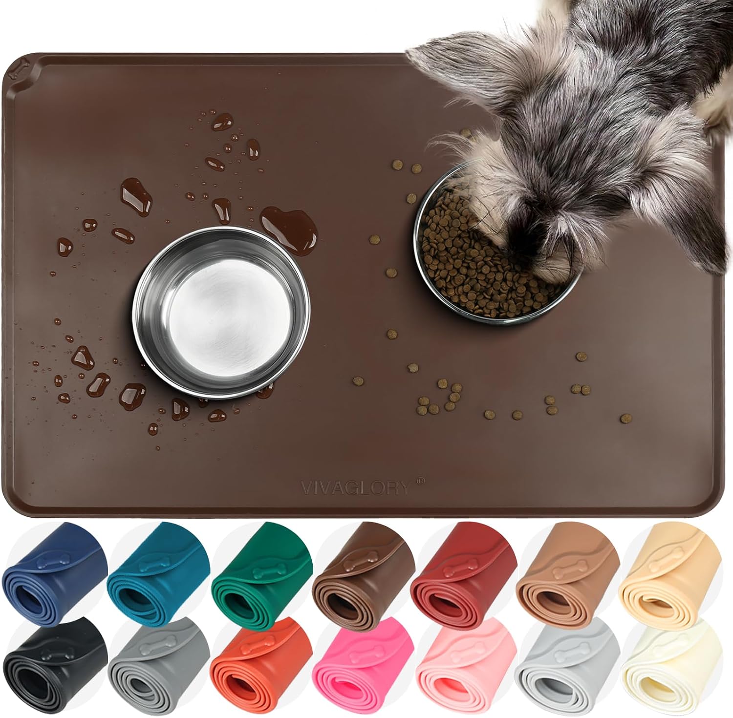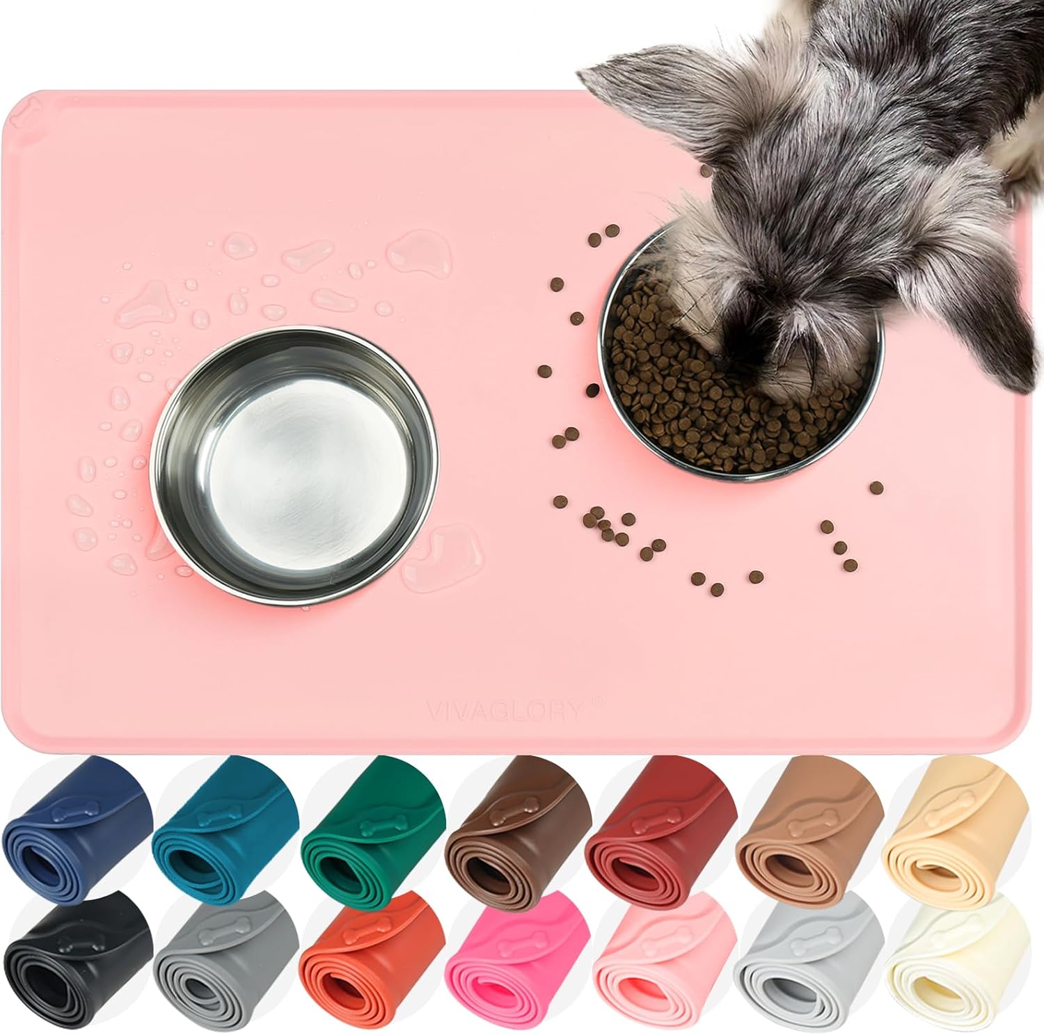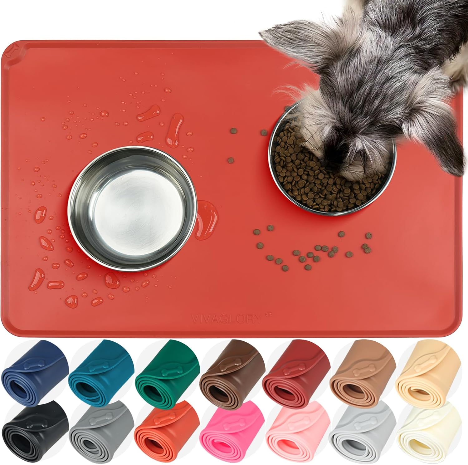 - Keeps Floors Clean: Say goodbye to messy floors! The VIVAGLORY flexible pet feeding mat is made from naturally waterproof and non-slip silicone, providing enhanced grip to reduce skidding during mealtime. Plus, the raised edge effectively catches spills, preventing them from spreading onto your floors and protecting against stains. This helps maintain a tidier feeding area. The dog placemat is available in two sizes: Small for 1-2 small bowls, Large for 1-2 medium or large bowls