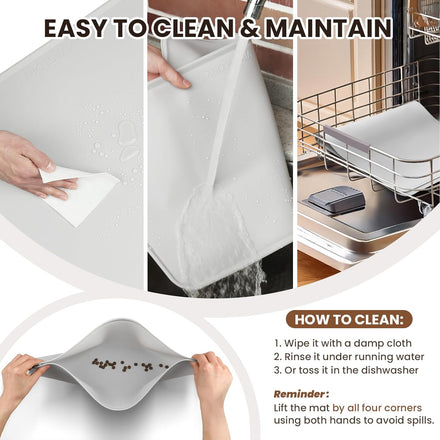 - Easy to Clean & Maintain: Keeping this cat food mat clean is a breeze! The seamless design and smooth surface of this pet food mat make it easy to wipe away messes, and it dries quickly. You can clean the feeding mat with a damp cloth, rinse it under running water, or place it in the dishwasher. It's also safe to sterilize with boiling water—just keep the pet bowl mat away from direct heat. Plus, we offer long-term service, so you can buy with confidence