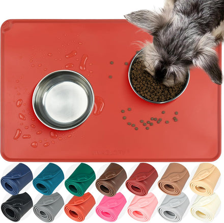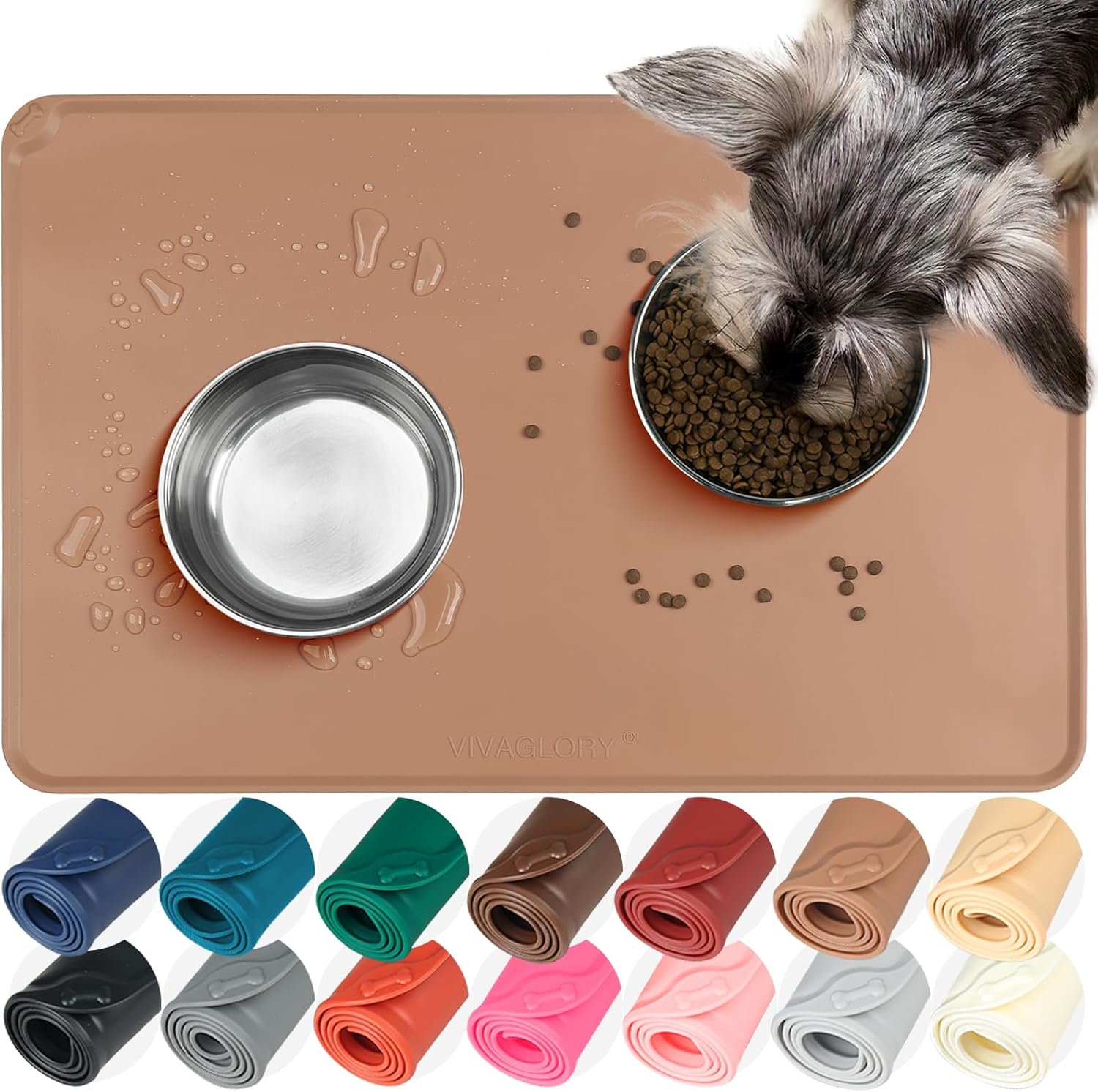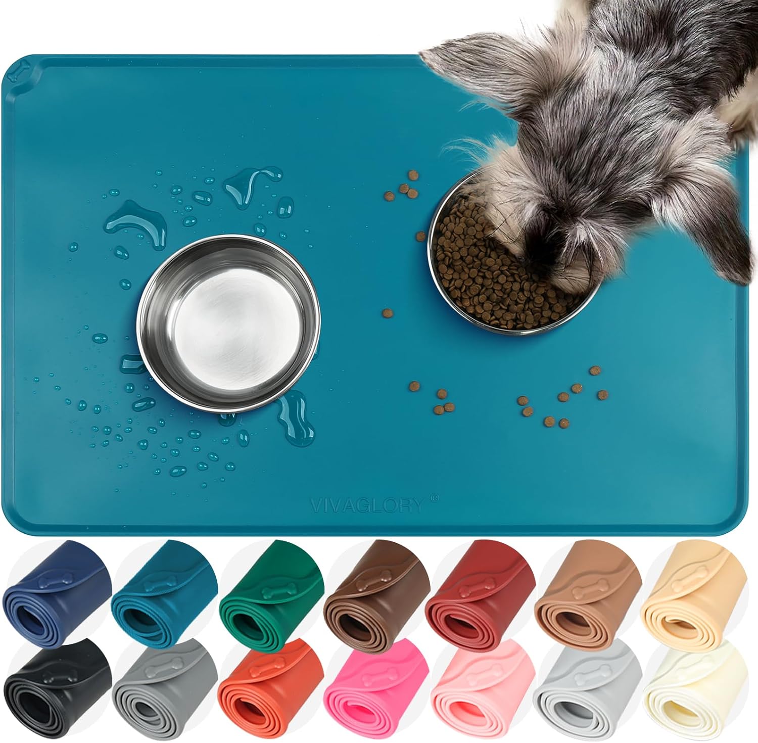 - Keeps Floors Clean: Say goodbye to messy floors! The VIVAGLORY flexible pet feeding mat is made from naturally waterproof and non-slip silicone, providing enhanced grip to reduce skidding during mealtime. Plus, the raised edge effectively catches spills, preventing them from spreading onto your floors and protecting against stains. This helps maintain a tidier feeding area. The dog placemat is available in two sizes: Small for 1-2 small bowls, Large for 1-2 medium or large bowls