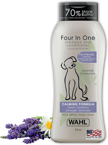 Our shampoos are concentrated, which means a little bit goes a long way! Be sure to thoroughly rinse your dog after shampooing to leave no residual shampoo behind. In addition, it’s important to always comb out and dry your pet's coat; leaving your dog with damp fur for hours can lead to protentional risk for dogs with sensitive skin. Wahl’s Calming Formula 4-in-1 shampoo contains lavender chamomile. This allows us to help gently cleanse, condition, detangle, & moisturizing your puppy’s coat and skin. The rich lather helps clean dirty coats and other environmental residue that dulls your dog’s coat and odor. Since our shampoo is easy to clean, it leaves your dog’s coat looking clean, silky, and smooth. Our plant derived ingredients make our shampoo the choice for owners who want to avoid harsh chemicals for their dog and themselves. Our shampoo is PEG-80 free, alcohol free, paraben free, and pH balanced. Our 24 oz size and concentrated formula allows for up to 70% more baths than other leading brands. Wahl has been serving professional vets and groomers for over 50 years. clean, condition fur & hair for a smooth, soft coat. We are a company of animal lovers that want the best for your family member.