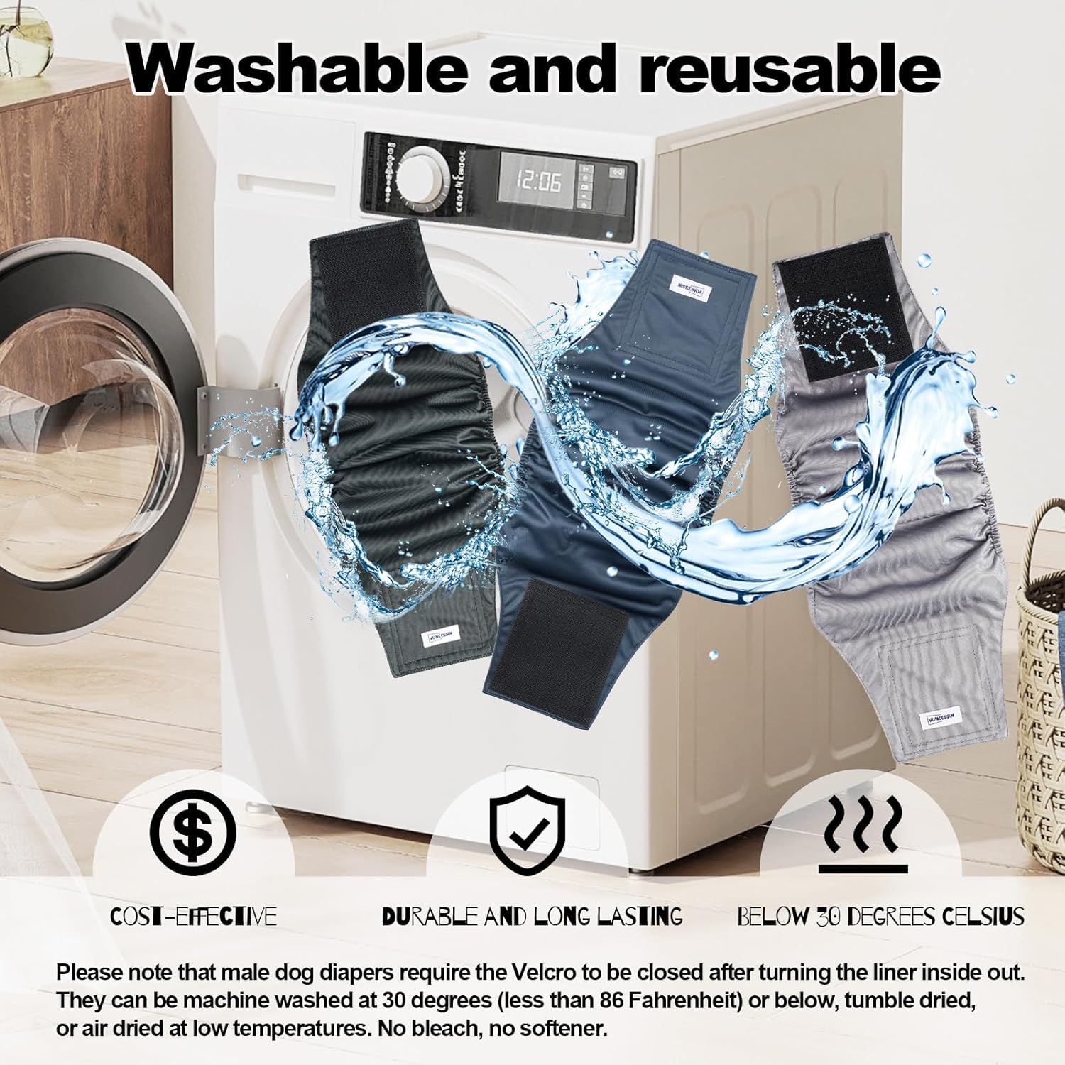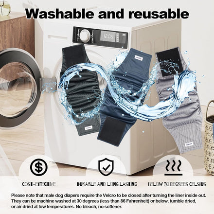 - Durable and Frugal: The boy dog diaper wraps are designed for durability with precision stitching to withstand daily use and frequent washing. Doggie diapers for males are machine washable at 30 degrees Less than 86 Fahrenheit) or below, tumble dry, or air dry at low temperatures. No bleach, no softener.
