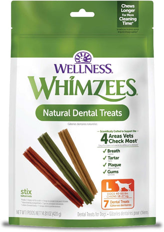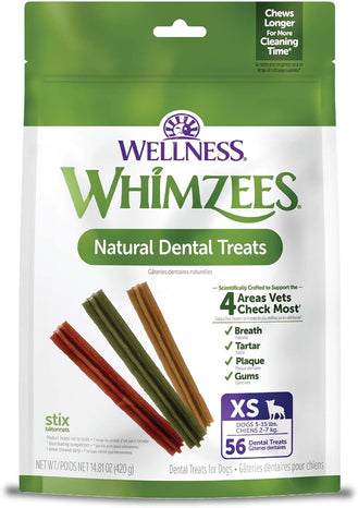 You brush daily, your dog should too! Give your dog one WHIMZEES® per day and you’re giving them a fun, all natural way to help clean teeth, freshen breath, and reduce plaque and tartar – all while they chew! Dental disease is the number one health issue for dogs, affecting 80% of adult dogs. That's why we believe it's more important than ever to take an active role in your pup's at-home dental care. What separates WHIMZEES® from the pack? Designed by our team of pet health experts, WHIMZEES® are scientifically proven to help control plaque and tartar and freshens breath. Based on studies of comparable products conducted by an independent kennel, WHIMZEES® lasts longer, for more cleaning time than the leading dental chews. Support your dog’s oral health with WHIMZEES®!