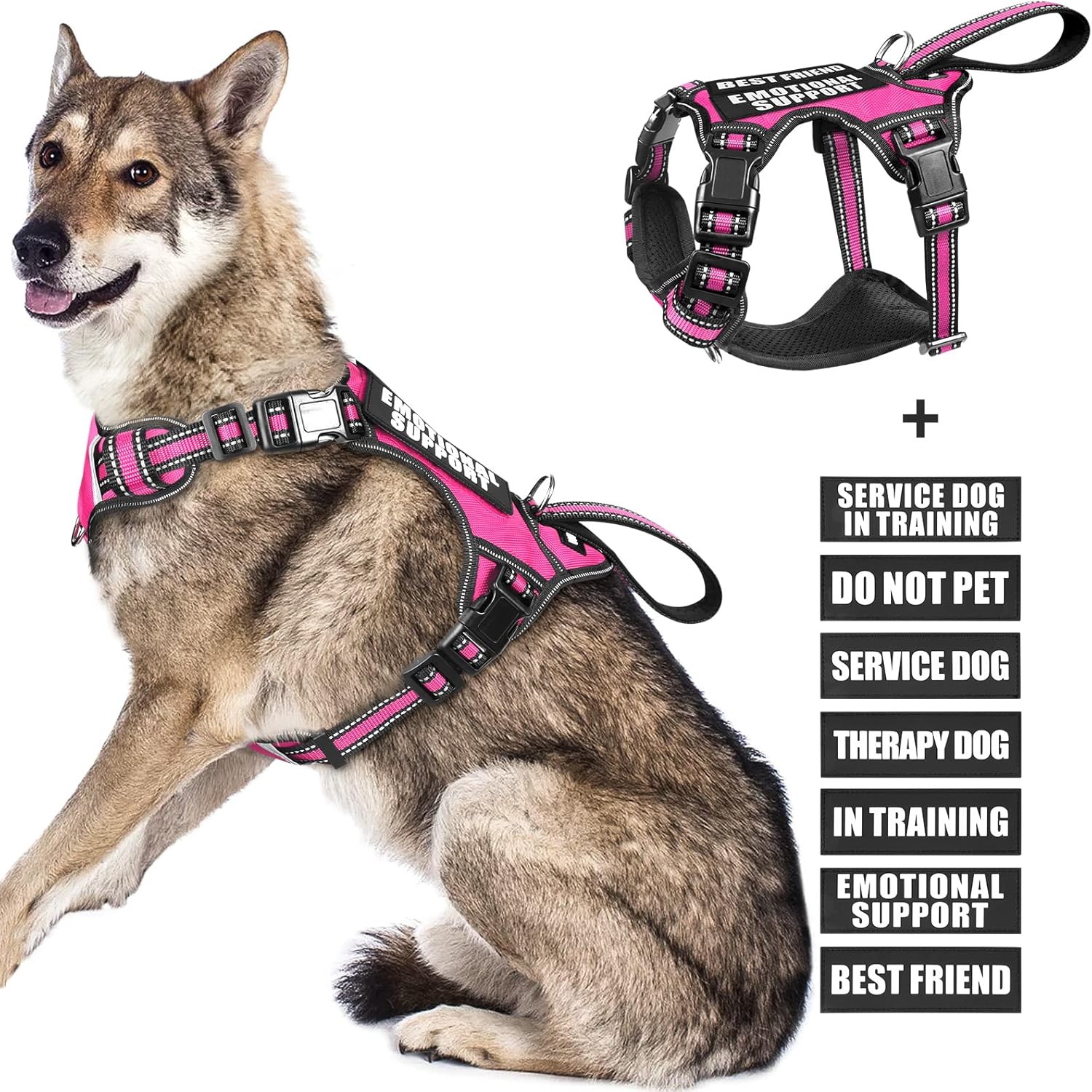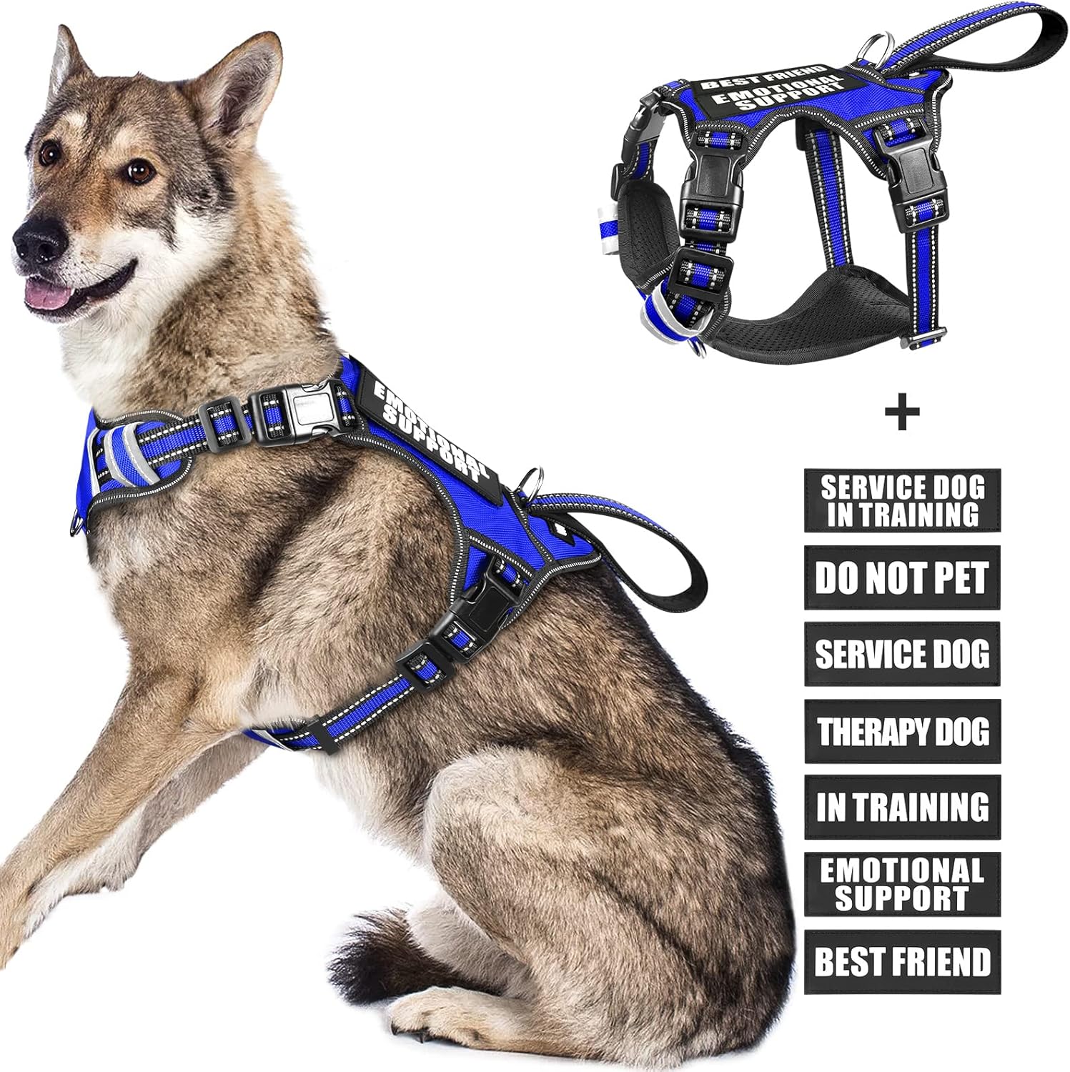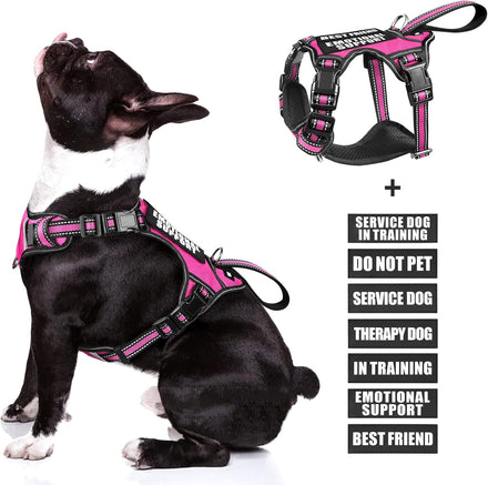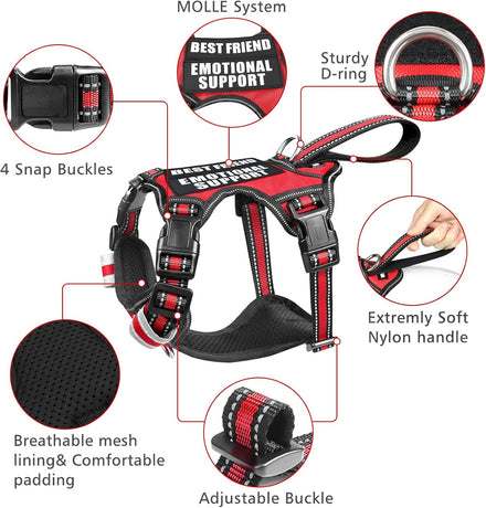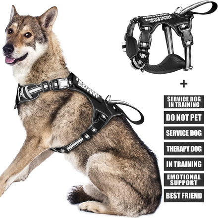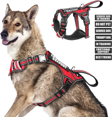WINSEE Service dog harness contains a NO PULL dog vest harness and 7 pieces of dog patches with sewed letters that are enough quantity for you to decorate the dog’s vest harness. The reflective standard harness with a control handle that doubles as a car tether to keep your dog restrained during rides. The harness comes in four sizes and has 4 adjustable buckles for a near custom fit for your dog.
