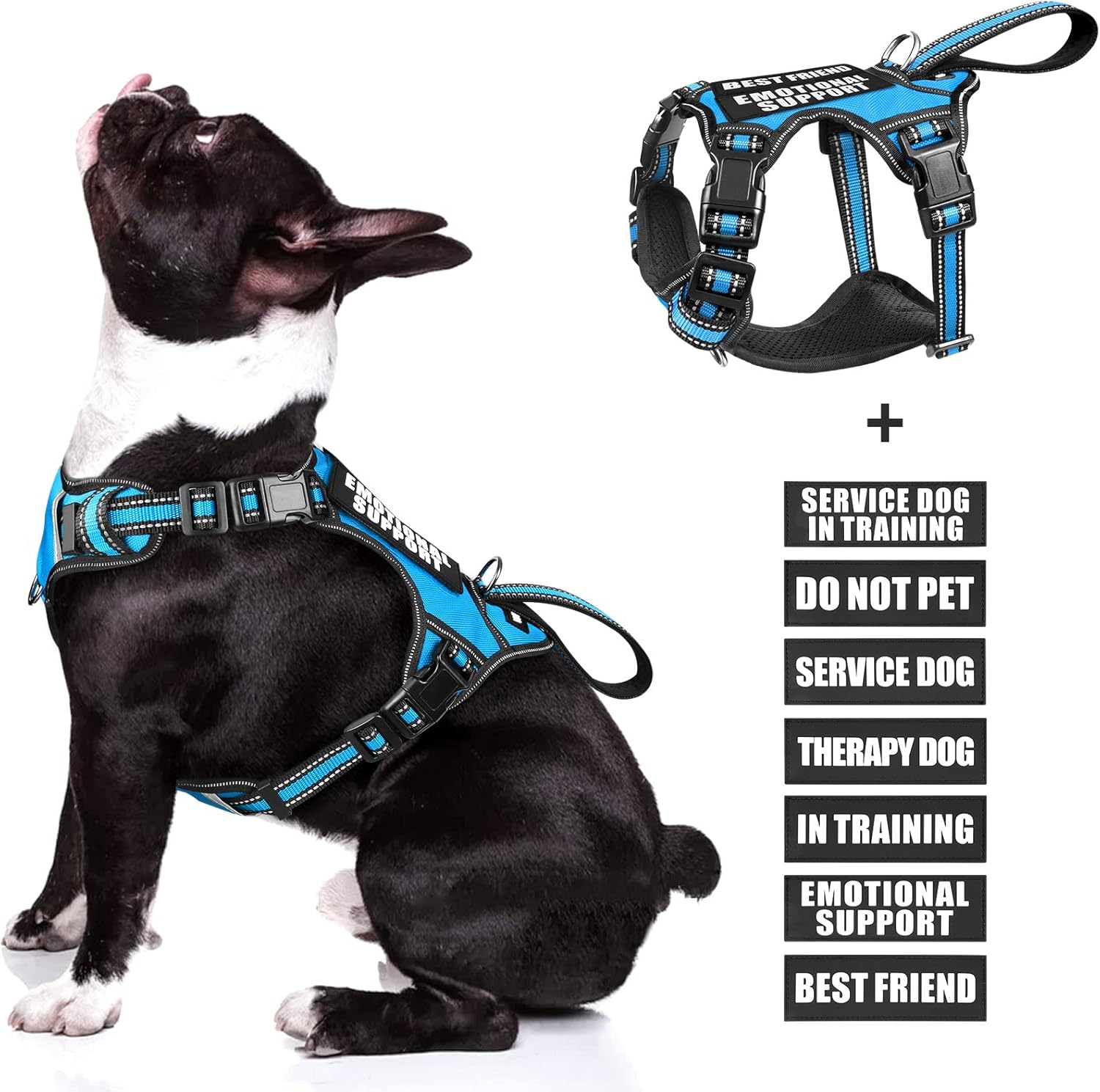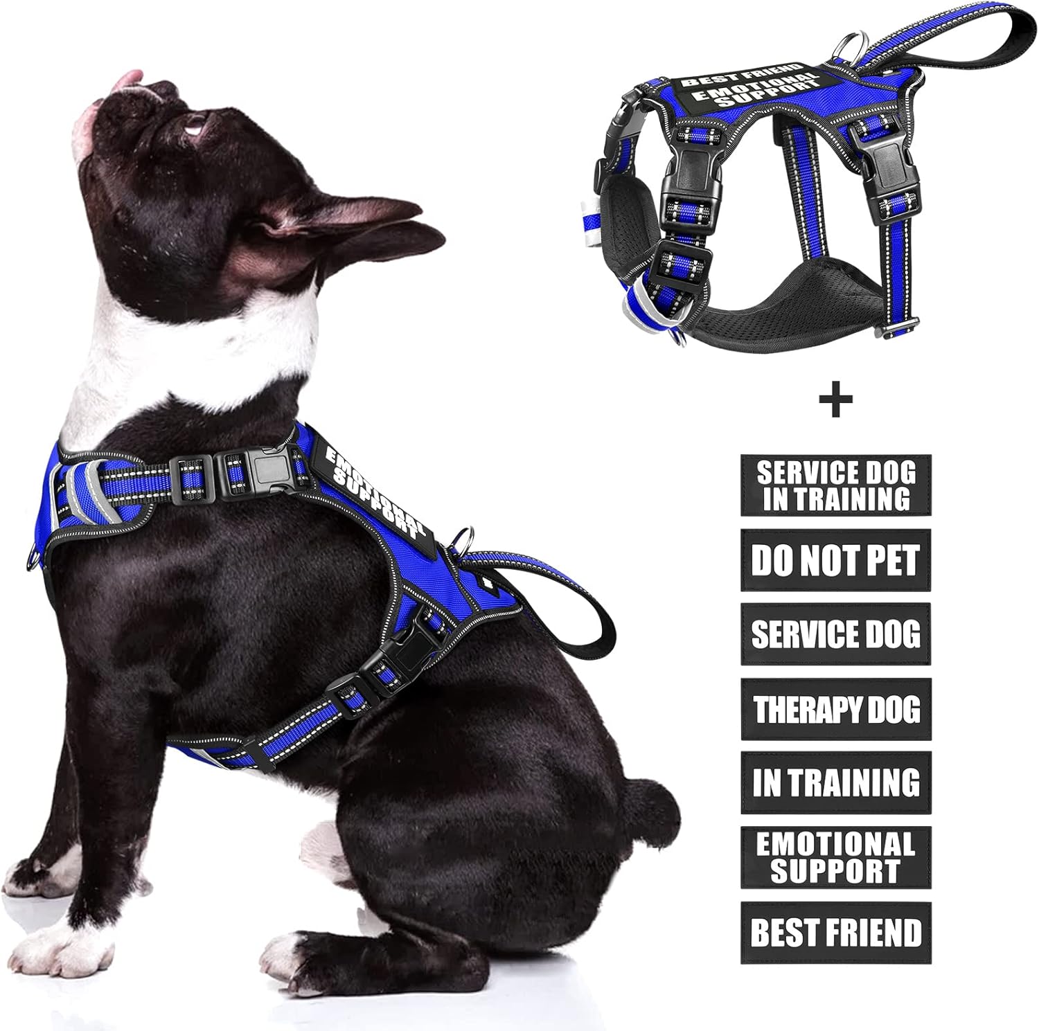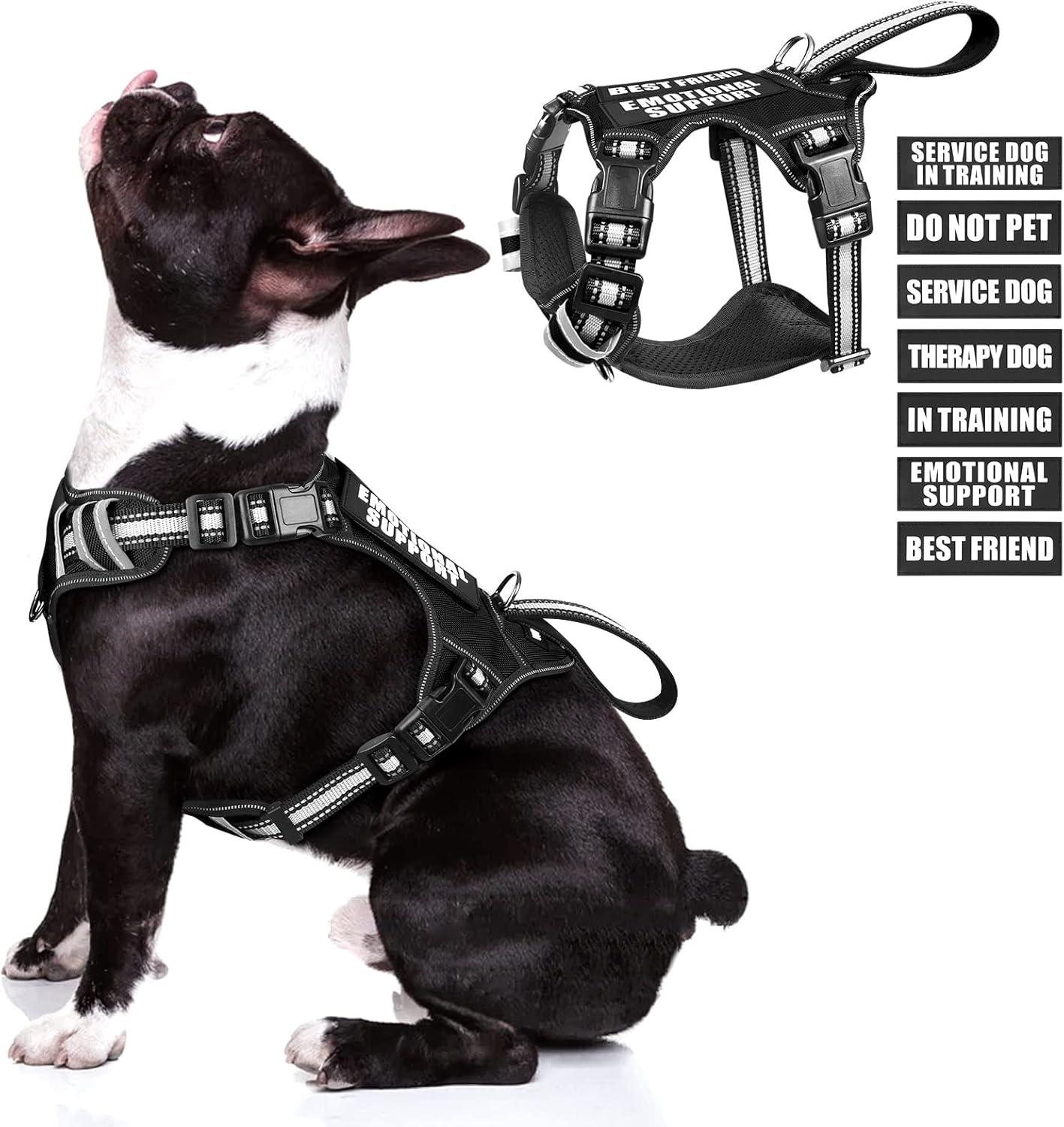 WINSEE Service dog harness contains a NO PULL dog vest harness and 7 pieces of dog patches with sewed letters that are enough quantity for you to decorate the dog’s vest harness. The reflective standard harness with a control handle that doubles as a car tether to keep your dog restrained during rides. The harness comes in four sizes and has 4 adjustable buckles for a near custom fit for your dog.