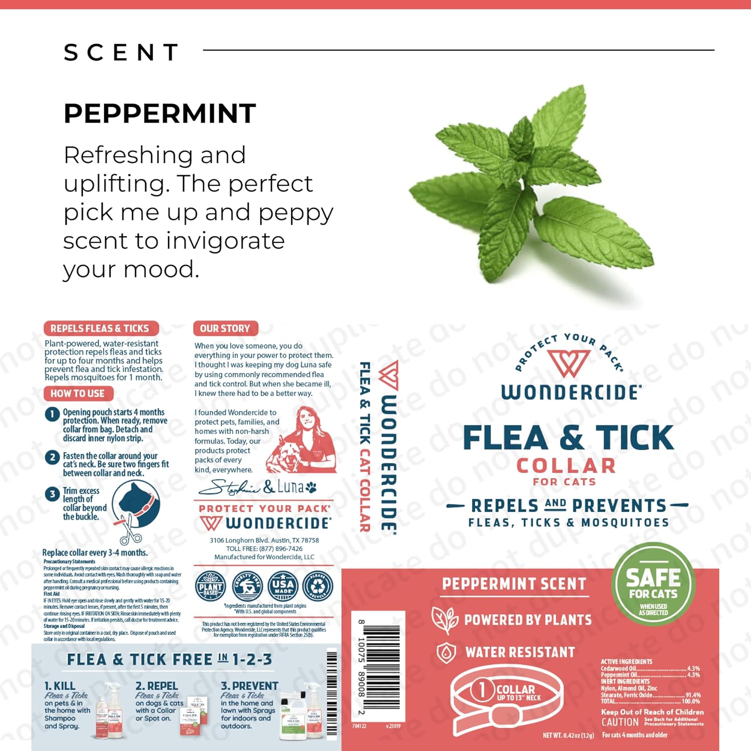 - WATER RESISTANT WITH FRESH PEPPERMINT SCENT. This plant-powered repellent smells amazing with the fresh essential oil of peppermint and is water resistant for the adventures you might go on with your kitty! This collar is not intended to be left on during bath or swim time.