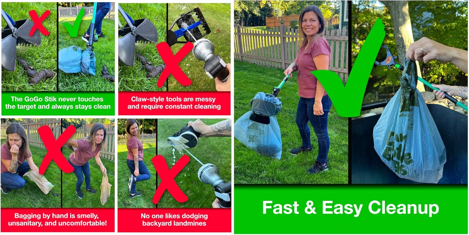 - SAVE YOUR BACK! No Bending. No Kneeling. No Touching or Handling a Stinky Bag. (For Indoor or Challenging Surfaces Like Gravel, Consider Using With the GoGo Stik EZ Dootie Rake!)