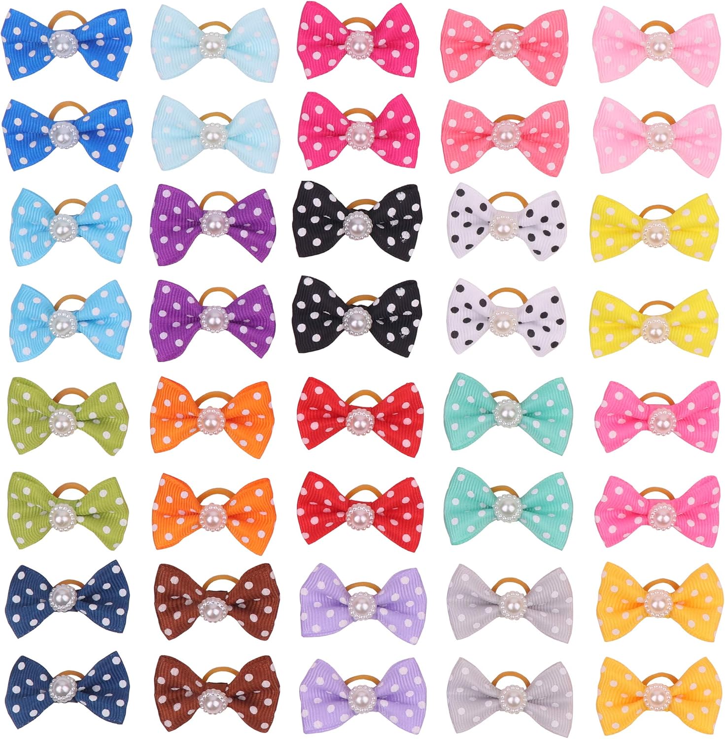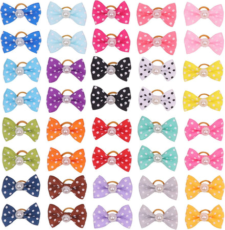 Dots Small Bowknot with Rubber Bands,20Pairs(40Pcs)20 Color can give you many choices to dress up your dogs. Size: Length-1.5inch (40mm), width-0.98 inch (25mm) Package: 40pcs/20pairs hair bows 100% New Condition and top quality.Pure handmade Widely Used: Very cute hair bows, make your pet (dog,cat,rabbit)looks more lovely and attractive,can DIY dog bow tie.They also can fit for baby girls cat ,rabbit,It can make your pet look more fashionable and attractive Note: 1.Bows Backside with Rubber Bands,front side with White round pearl . 2.Check the Bows size carefully before buying. 3.Note due to the totally made by hand of these flowers there may be slight variations in size and shape in each flower,Need to be sorted by hand . 4.A few are a tad out of shape form the packaging and the trip, But it can be repaired . NO worries 5.Each package will be sent 1-2pcs more Used in transit damaged beyond repair 6.Suitable for hair thick and have a certain length or pets,Gently remove, to avoid harming the pet's hair.