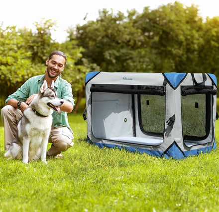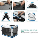 This travel dog crate is easy to assemble, features collapsible support bars and retractable springs, allowing you to fold it flat and save vehicle space when not in use.