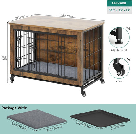 This versatile dog crate combines comfort, mobility, and style. Equipped with a cozy cushion and pull-out tray for easy cleaning, it ensures a tidy, odorless environment. The crate's four wheels (two with brakes) and adjustable feet provide stability and ease of movement. Dual doors with double locks offer secure access, while the iron and wood construction ensures durability. Perfect as an end table or nightstand, it adds elegance to any home.