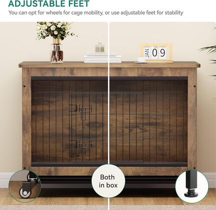 - Mobile and Stable: The dog cage sits on 4 wheels (2 with brakes) so it can be easily moved and securely positioned anywhere in your home; The adjustable feet ensure stability on uneven floors, providing your pet with a steady and safe environment
