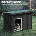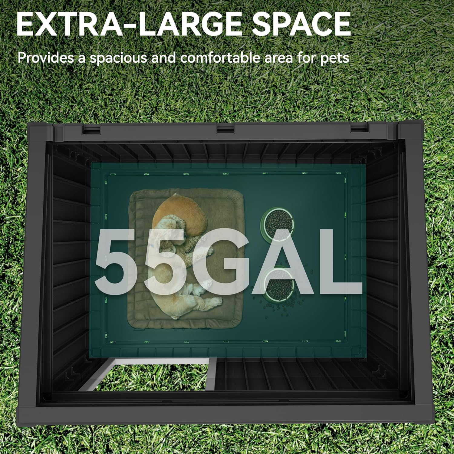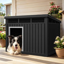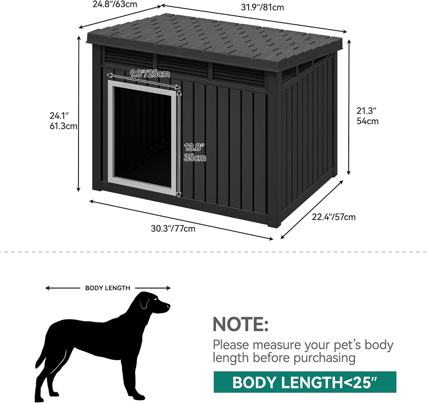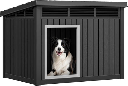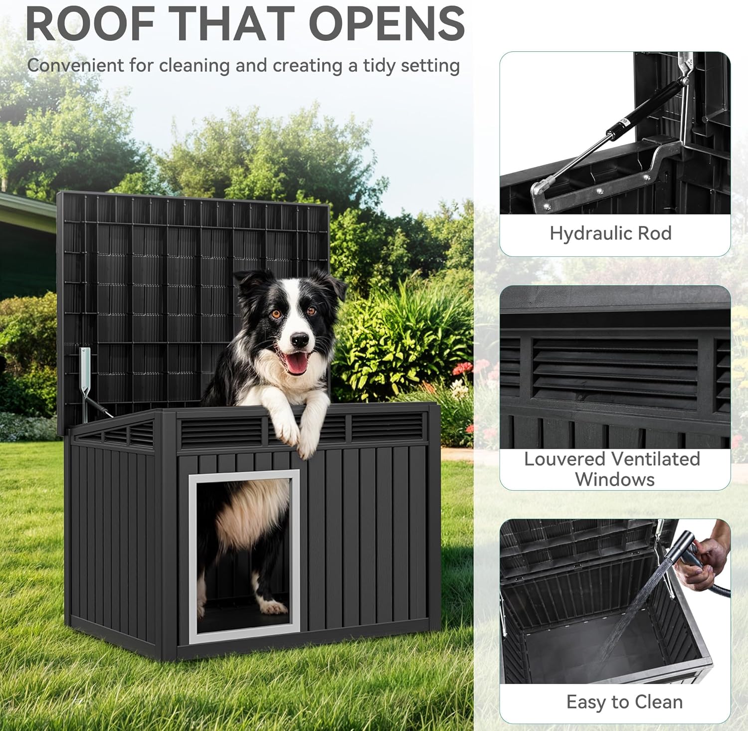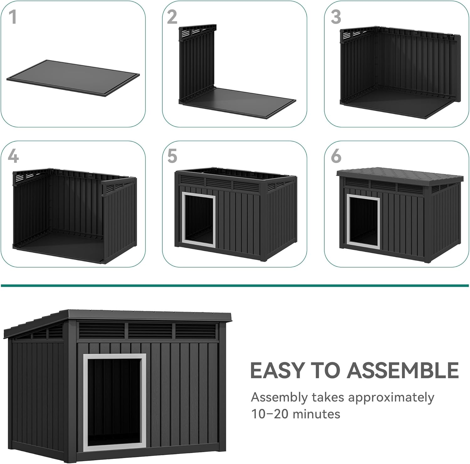 - Durable & Stylish Construction: Made from tough polypropylene (PP), this outdoor dog house is sturdy and sleek; Its chic gray sides, bold black roof, and matching black door frame create a stylish addition to any backyard