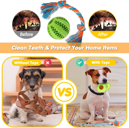 Your puppy play with our dog chew toys can get more benefits, such as clean teeth, ease boredom, avoid destructive chewing, etc. This super valued dog toys pack is nice for your puppy to get more happiness.