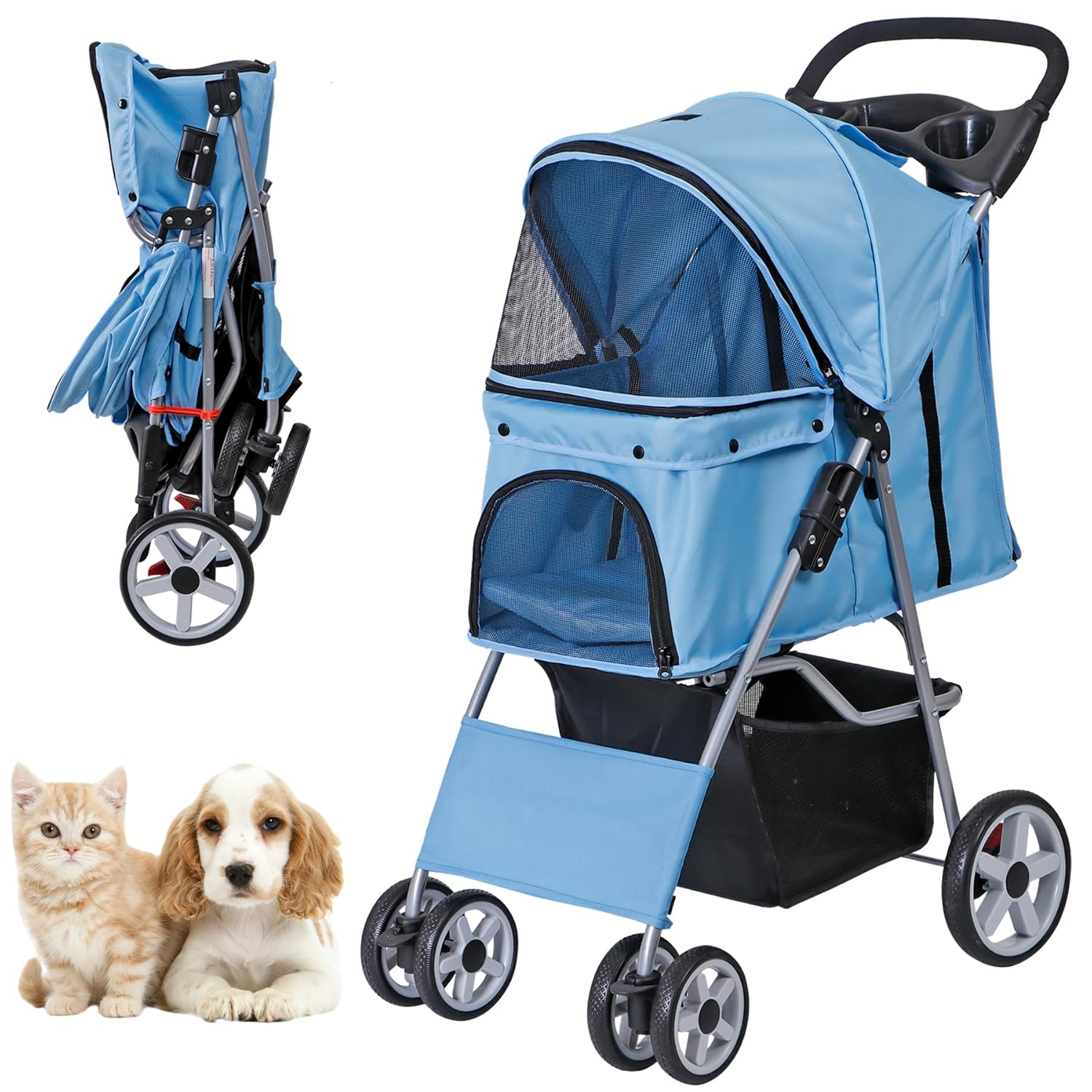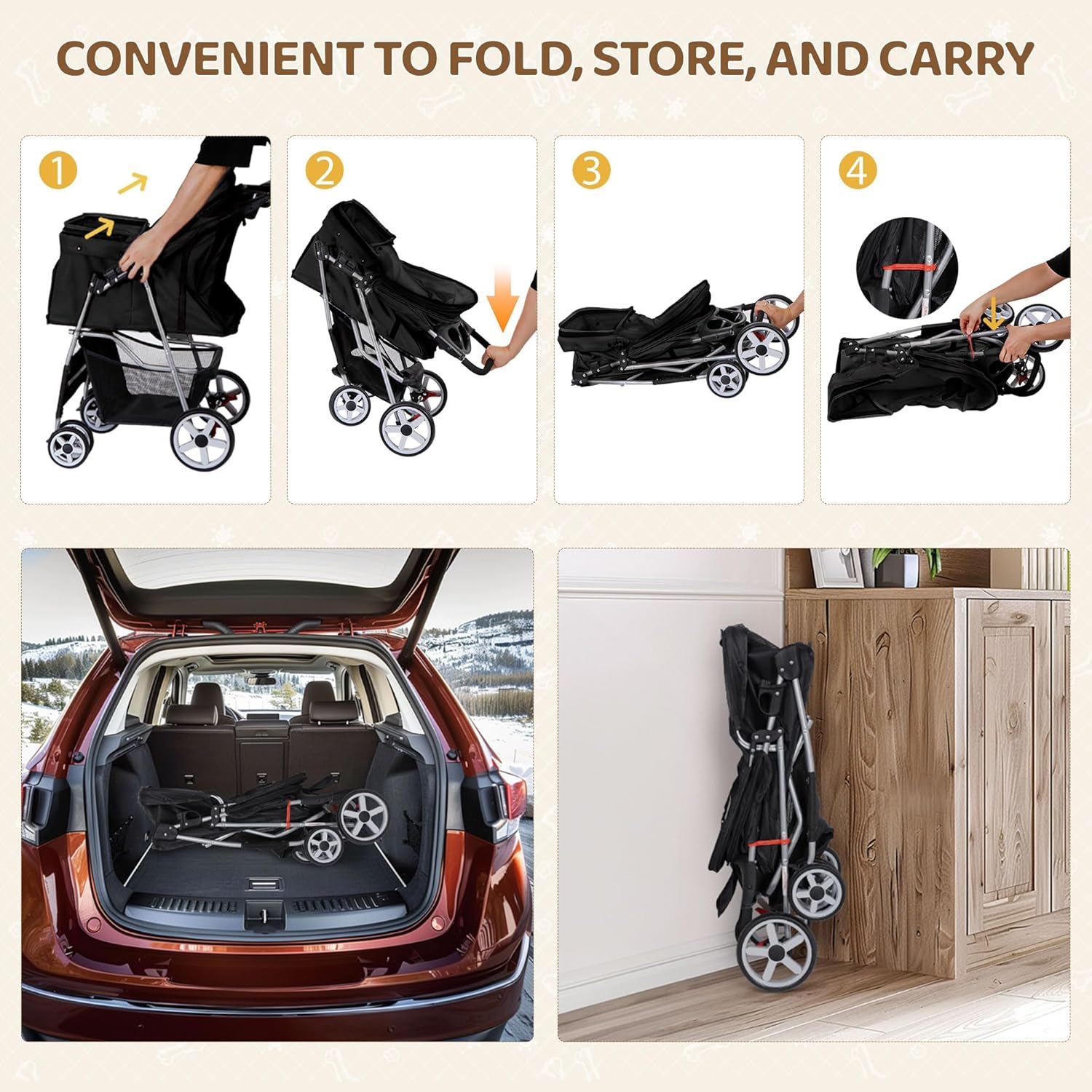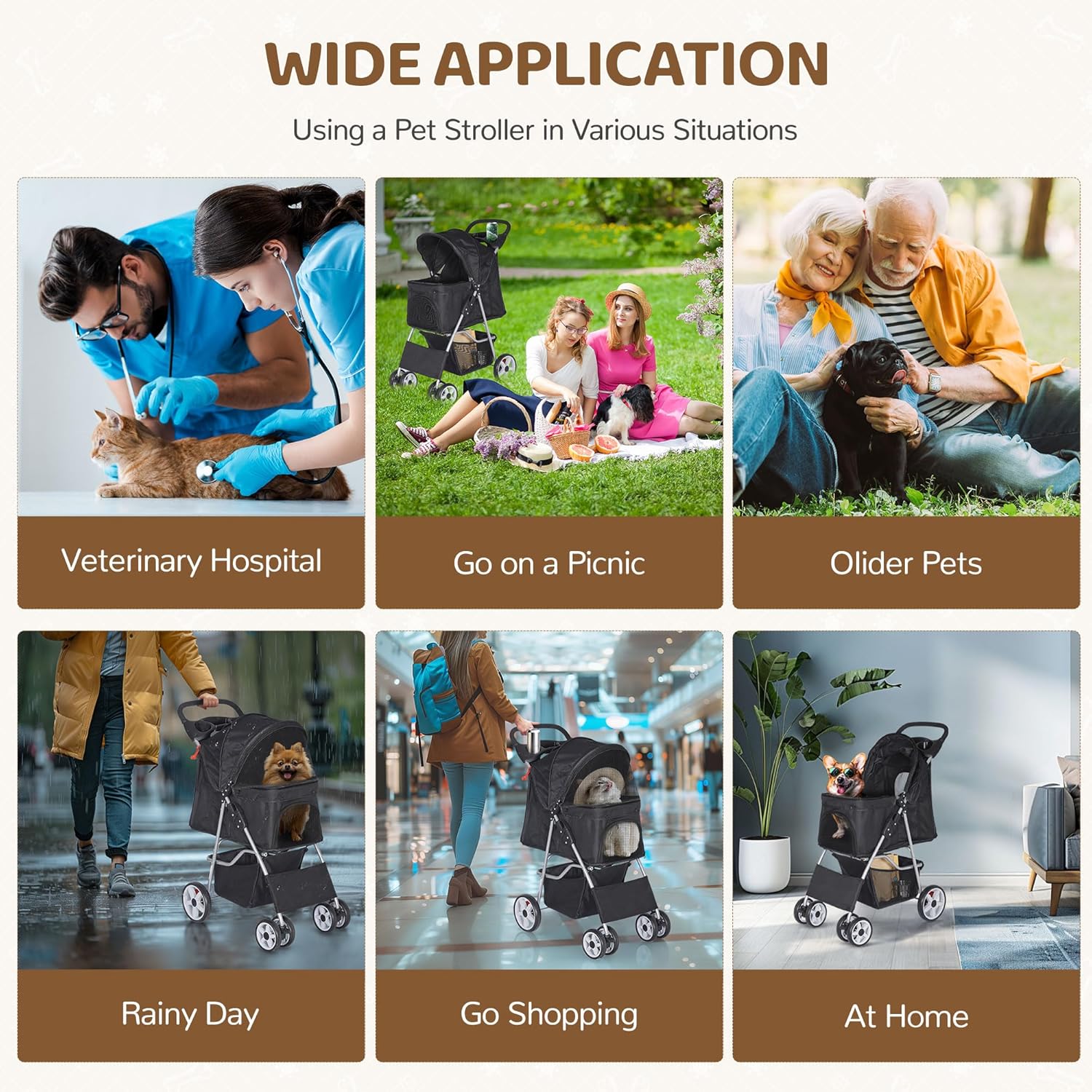 - 【High Quality Waterproof Material】This pet stroller is made of 400d waterproof Oxford cloth, which is water resistant and durable. This durable 4-wheeled stroller makes for a safe and smooth ride and it is perfect to hold any pets weighing up to 33 lbs