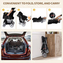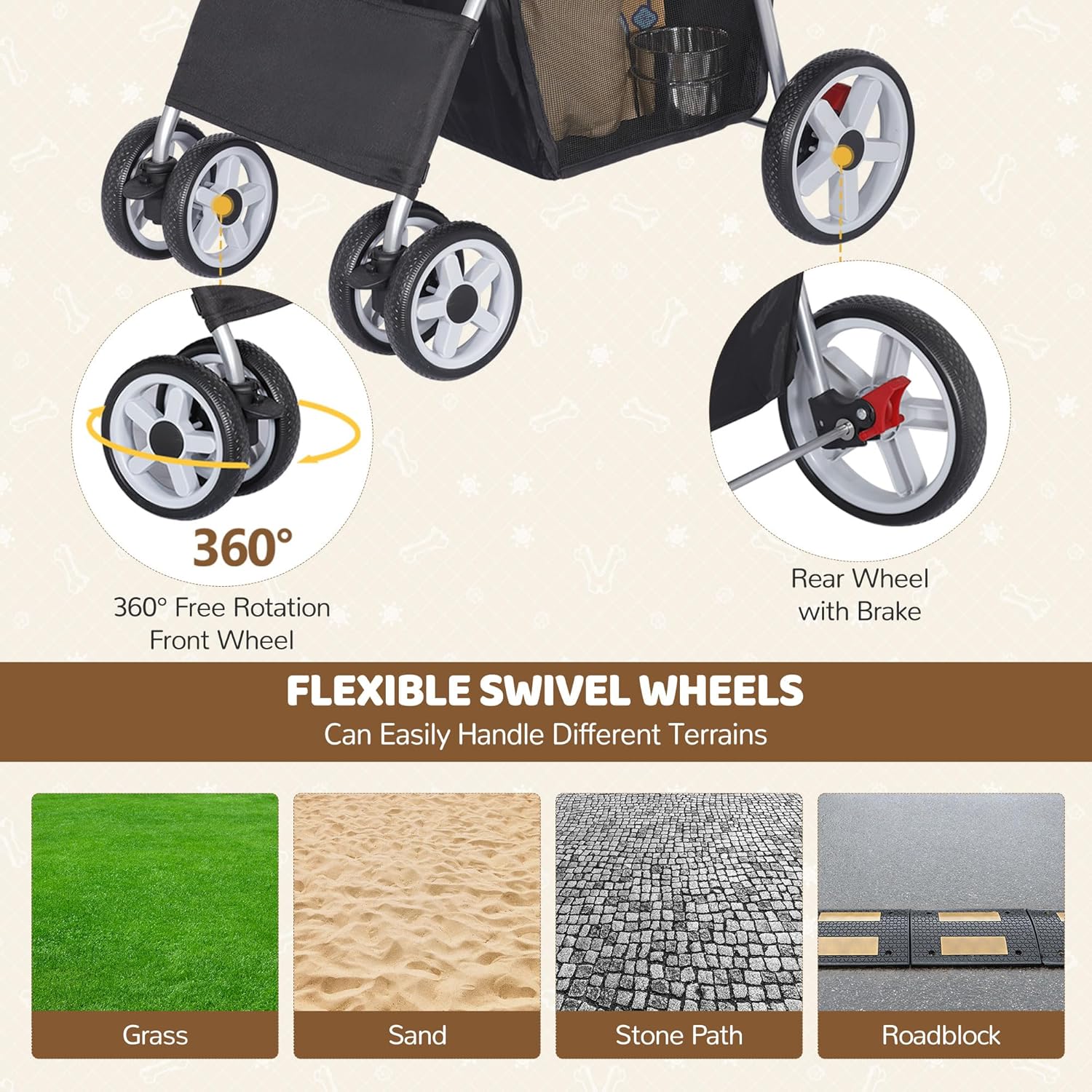 4-wheel design, 360-degree rotating front wheels with turn lock function, rear braking system, breathable mesh windows, spacious basket underneath the dog stroller for storage |