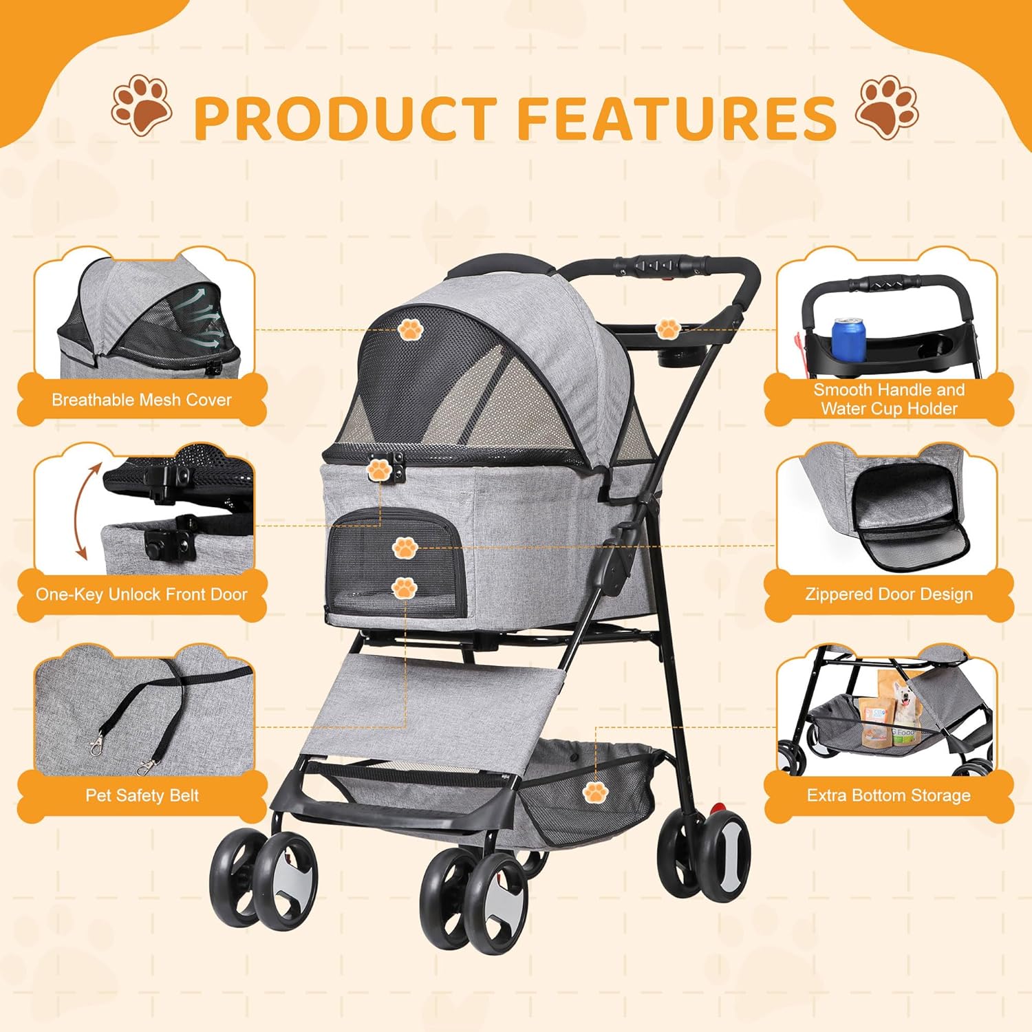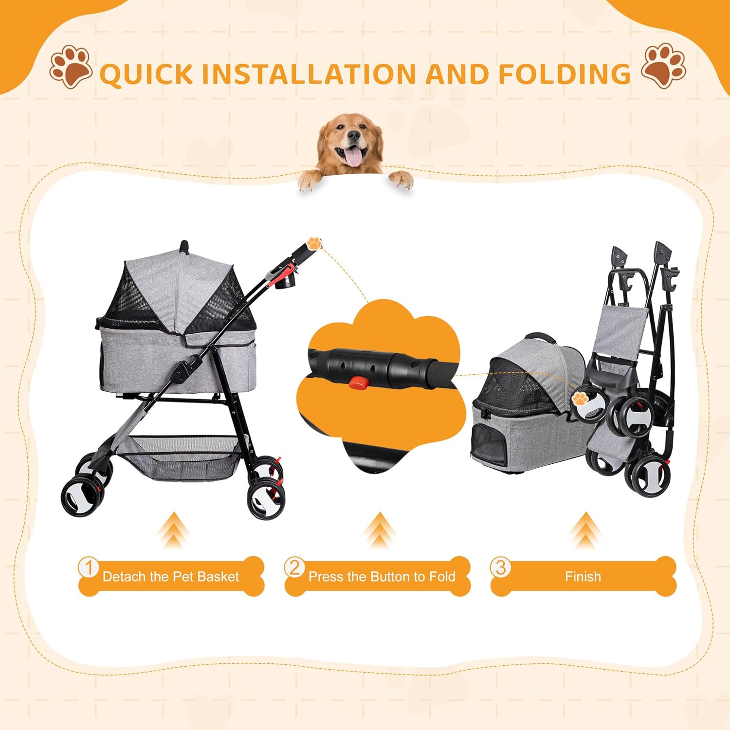 - 【High Quality Waterproof Material】This pet stroller is made of 600D waterproof Oxford cloth, which is water resistant and durable. This durable 4-wheeled stroller makes for a safe and smooth ride and it is perfect to hold any pets weighing up to 44 lbs