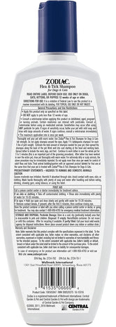 The Zodiac Flea & Tick Shampoo for Dogs & Cats is a concentrated lathering shampoo enriched with coconut extract that leaves your pet's coat soft and shining. It kills fleas and ticks through contact while conditioning your pet's coat. The shampoo removes loose dandruff, dirt, and scales while leaving a pleasant, fresh scent.